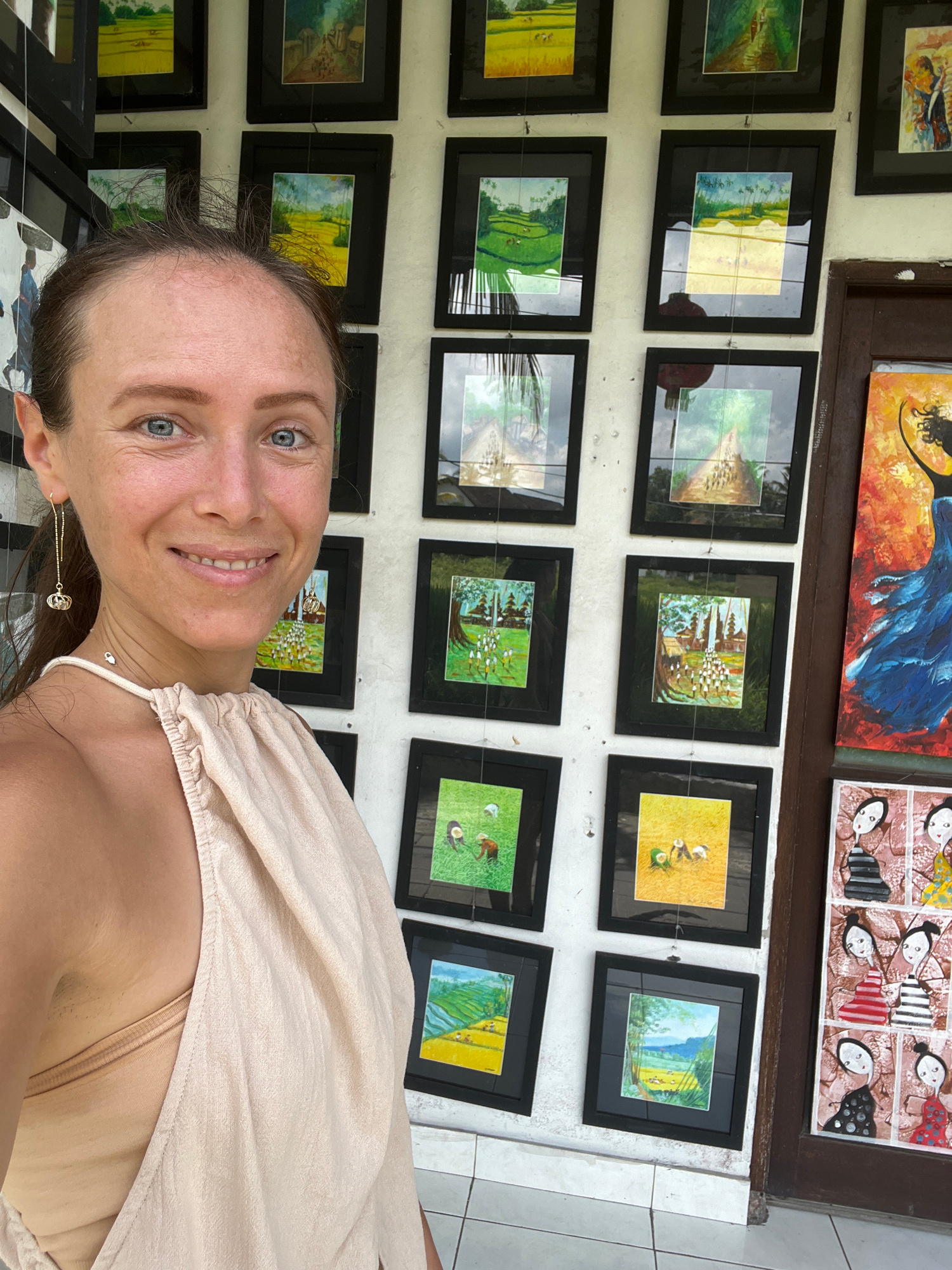 A woman is posing for a selfie in front of a wall of framed art in Ubud, Indonesia. The art consists of small paintings depicting landscapes and scenes, mounted in dark frames and arranged in a grid p…read more