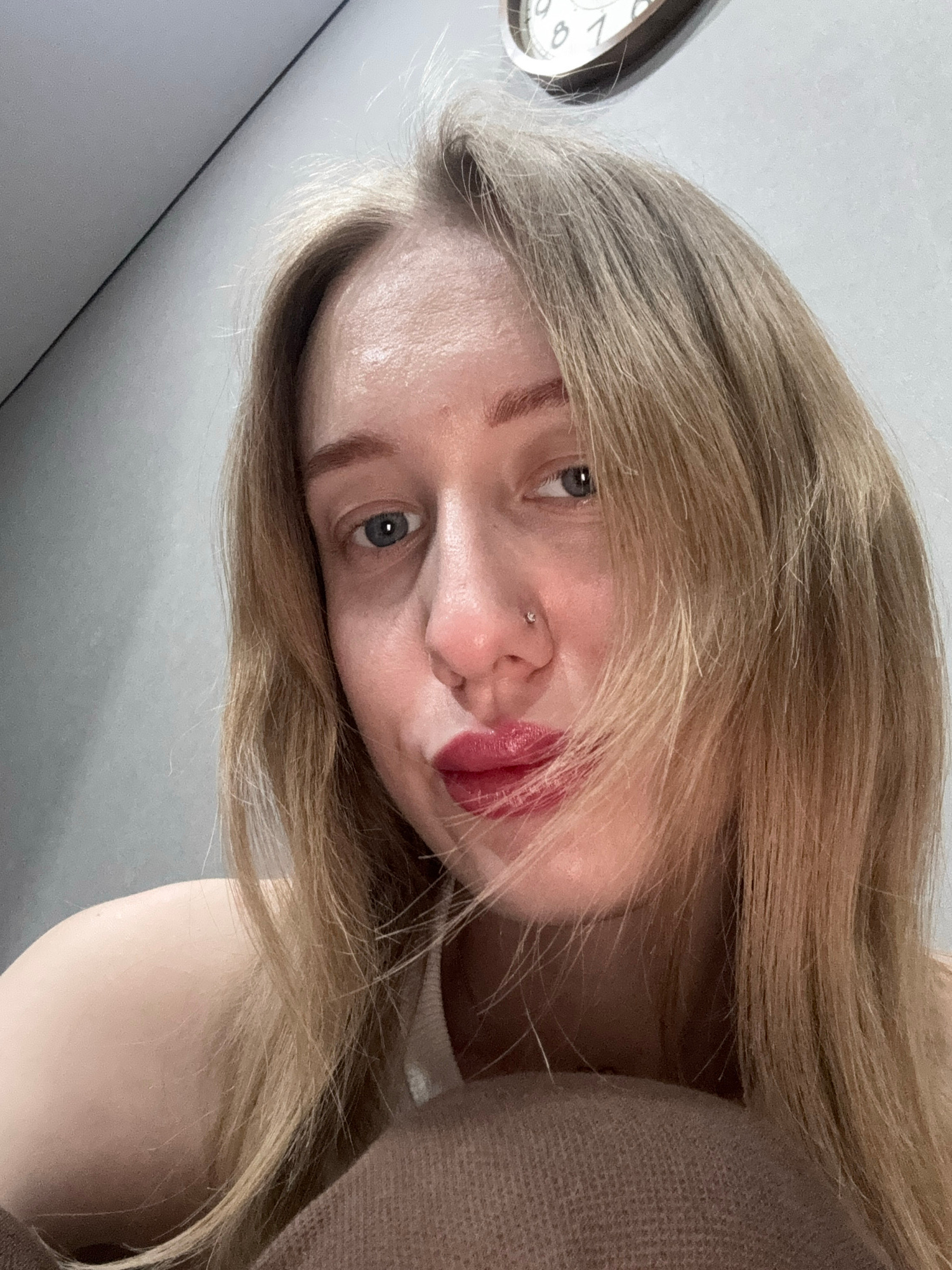 The image displays a close-up, front-facing portrait of a female individual. She has blonde hair that falls around her face and blue irises. A small, silver-colored stud is visible in her left nostril…read more