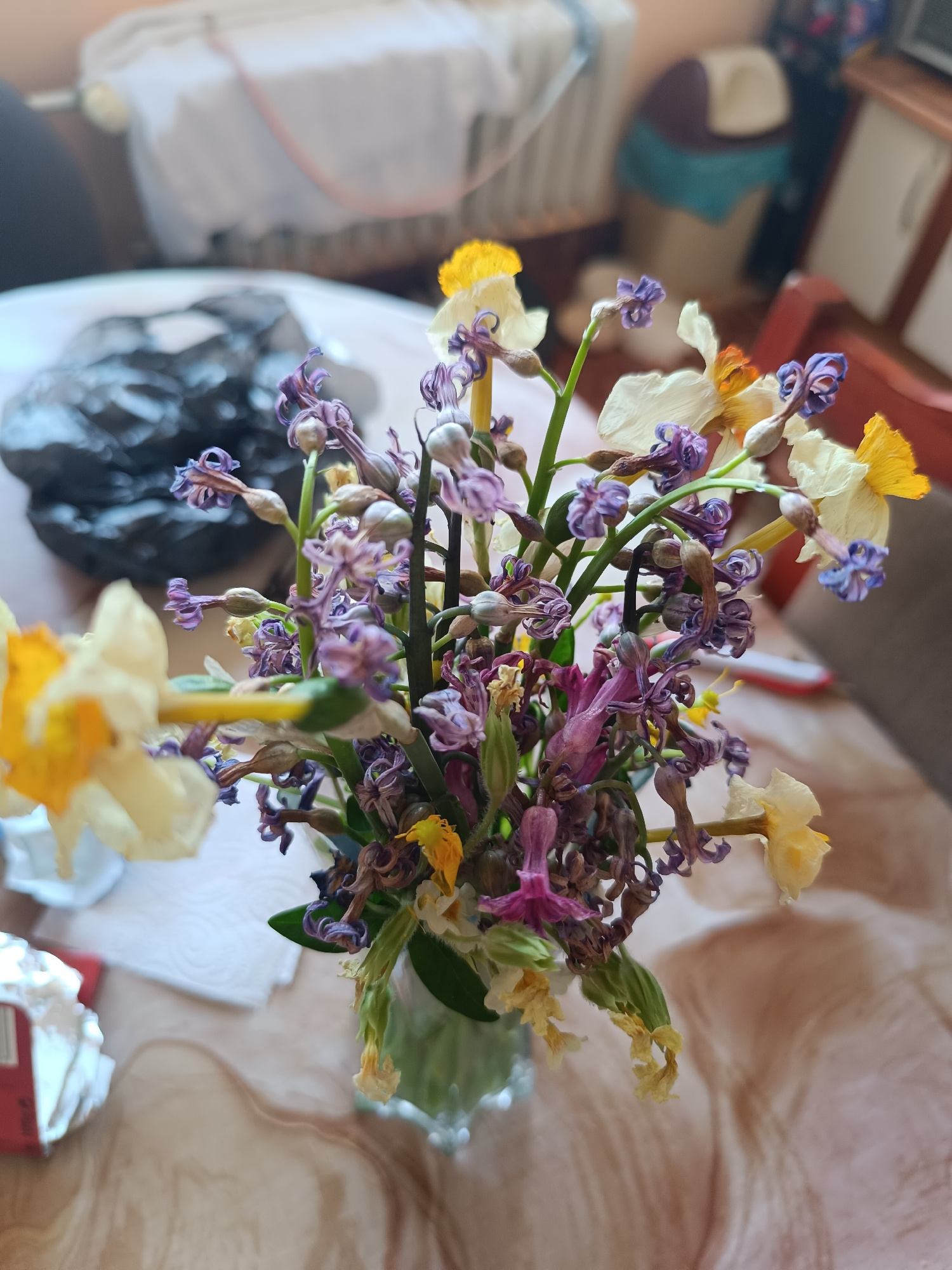 The image shows a bouquet of dying flowers in a glass vase placed on a table with a light brown, wood-like patterned surface. The bouquet consists of yellow and white daffodils and smaller purple flow…read more