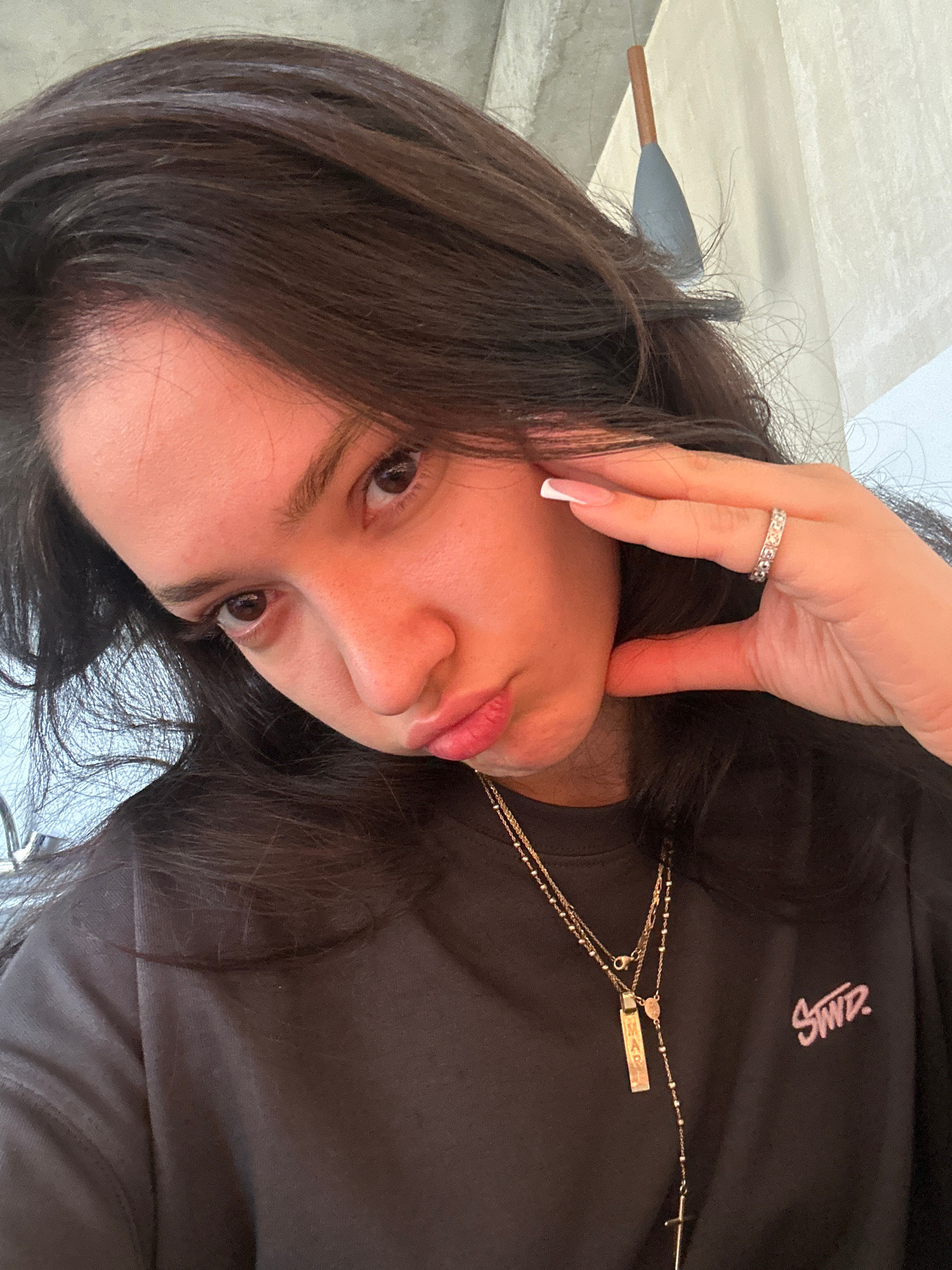 A close-up portrait features a person, likely a woman, with long dark brown hair, captured from an elevated angle with her head tilted to the right. Her right hand is gently placed against her cheek,…read more