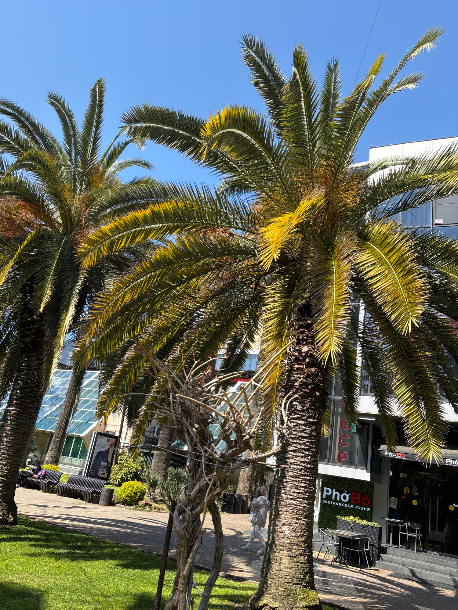 The image shows palm trees in Sochi, Russia. A Pho Bo Vietnamese restaurant is visible in the background. There is grass and a paved walkway. A metal sculpture of a person stands on the walkway. The s…read more