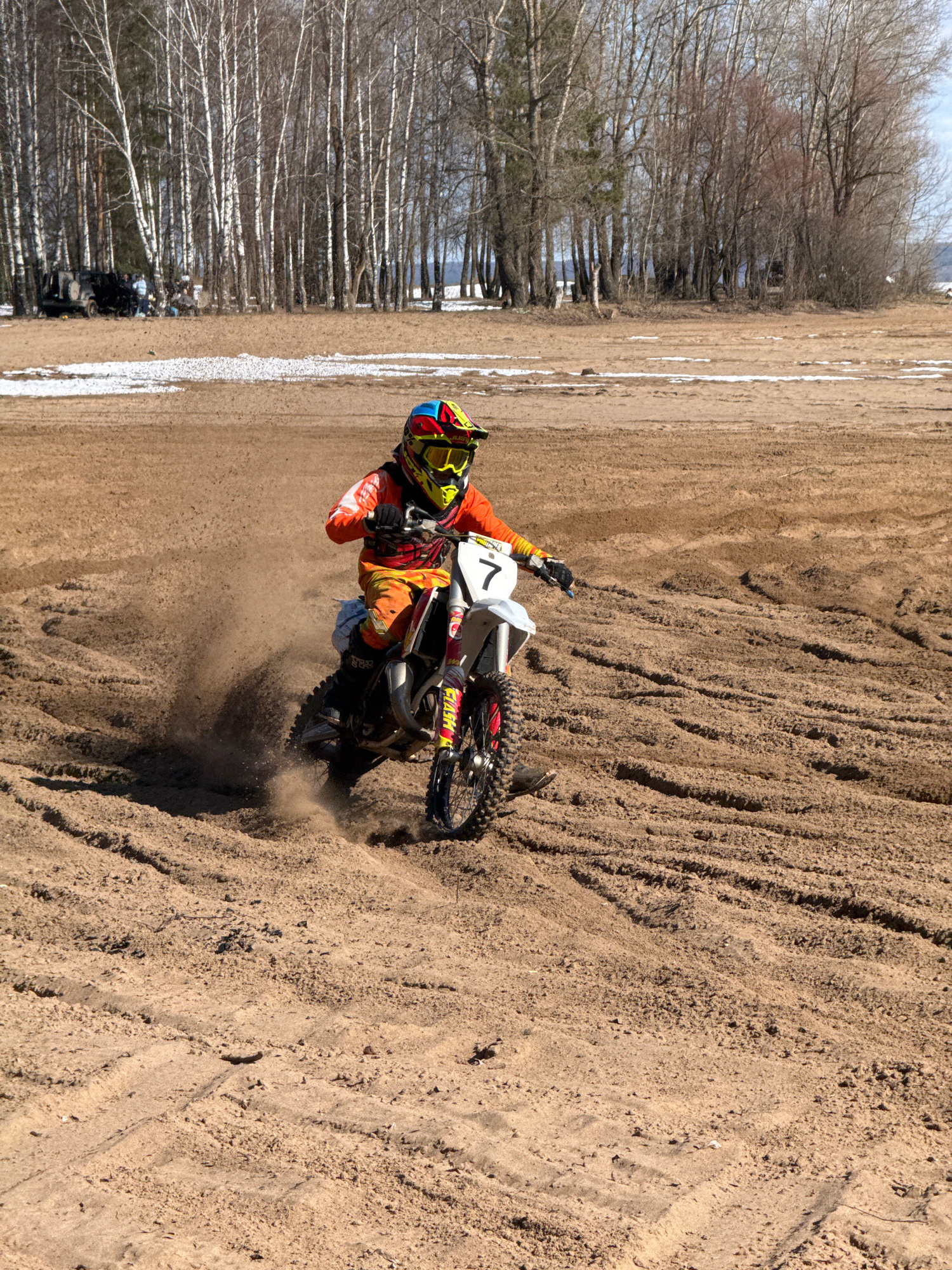 A dirt biker wearing an orange and black suit, protective helmet, and gloves rides a motorcycle on a dirt track. The motorcycle has the number "7" on its side and a sticker on the rear fender. The tra…read more