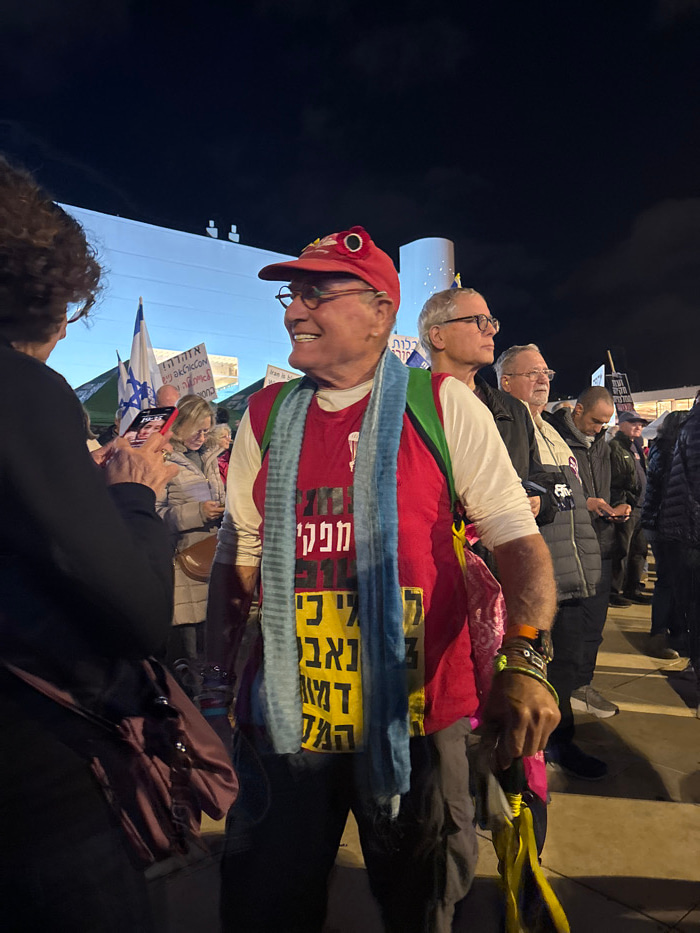 A nighttime outdoor scene captures several individuals. An older man with glasses and a red cap smiles, wearing a red t-shirt and a blue scarf. Text in Hebrew is visible on his clothing. Behind him, o…read more