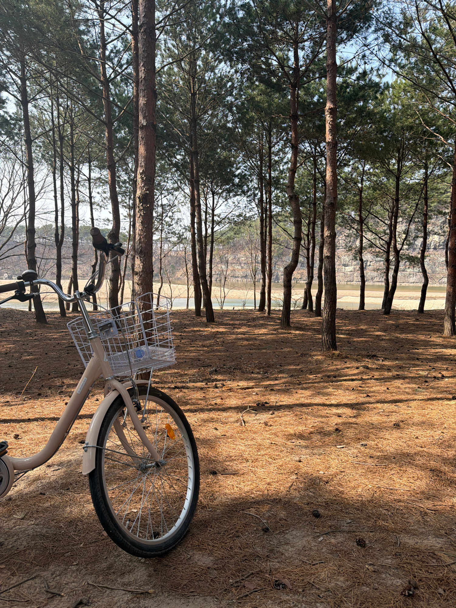 The scene depicts an outdoor environment in Andong-si, South Korea. A light beige, cruiser-style bicycle is positioned in the left foreground, resting on ground covered densely with dried, reddish-bro…read more