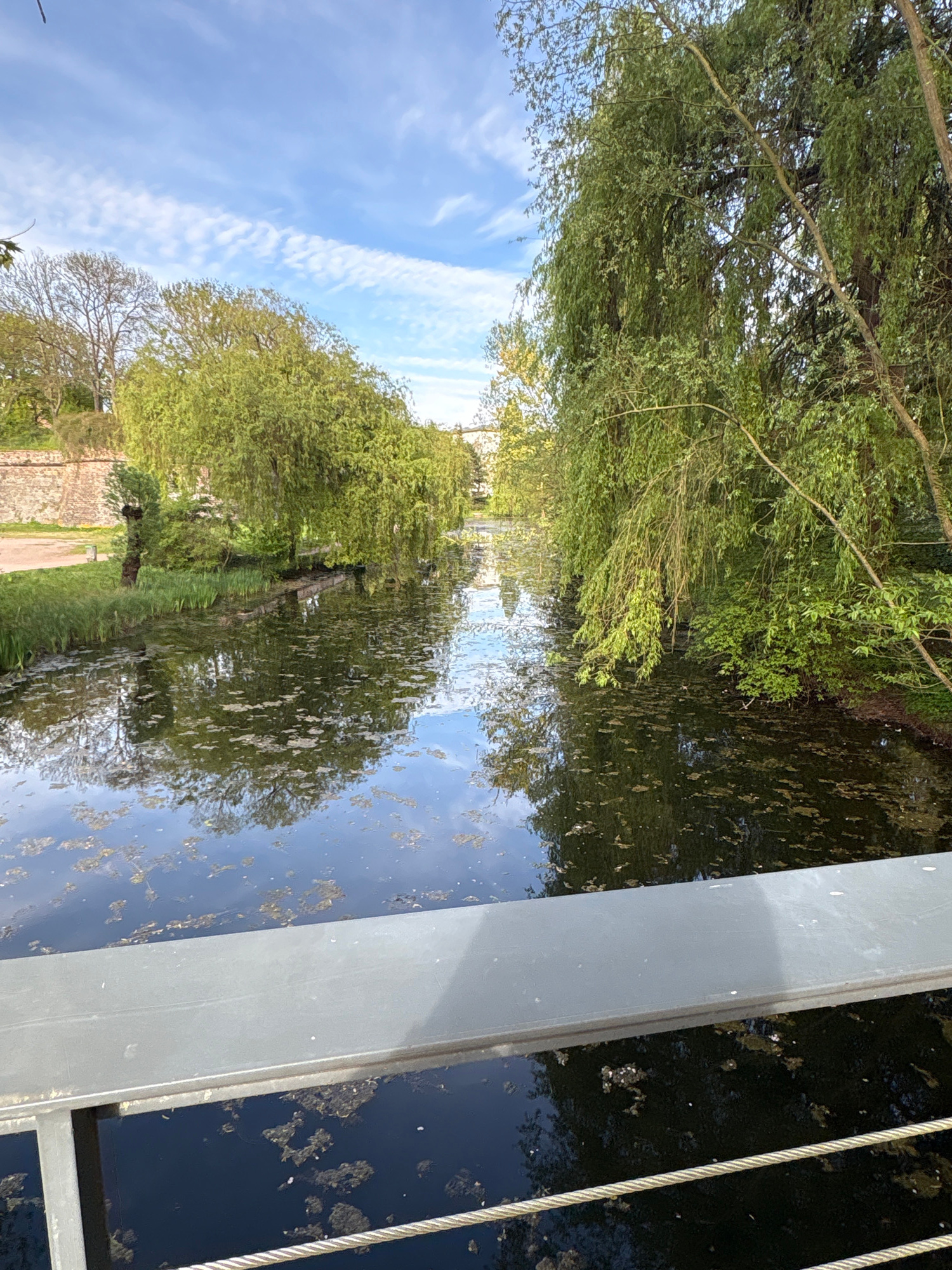 The image displays a tranquil outdoor scene, likely a canal or river in Strasbourg, France, captured on a clear day. The primary subjects include a body of water, lush green trees, a bright blue sky w…read more