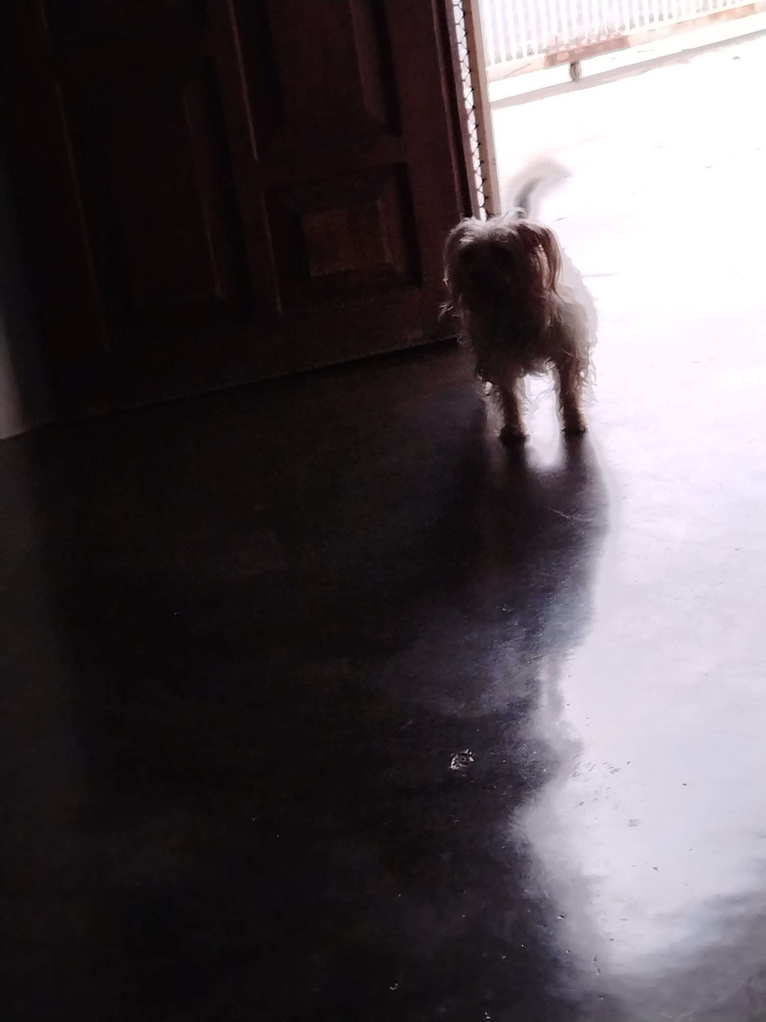 A small, light-colored dog stands in a doorway, facing the viewer. The doorway leads from a dark interior to a bright exterior, potentially a porch or balcony with a light-colored railing visible outs…read more