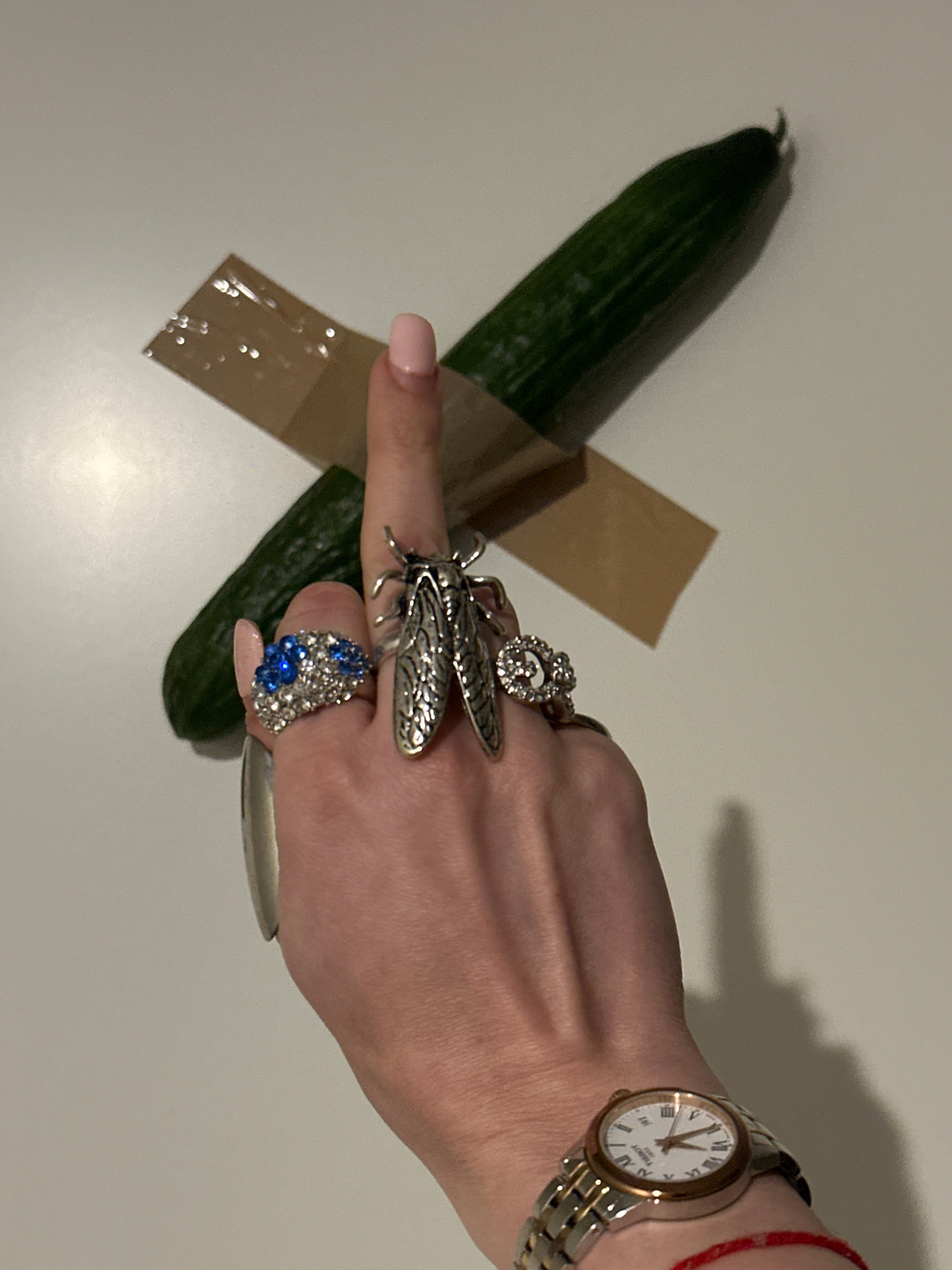 A close-up shot displays a hand adorned with multiple rings, including a prominent insect-shaped ring on the index finger, which is holding a cucumber in place with a piece of tape. A watch is visible…read more