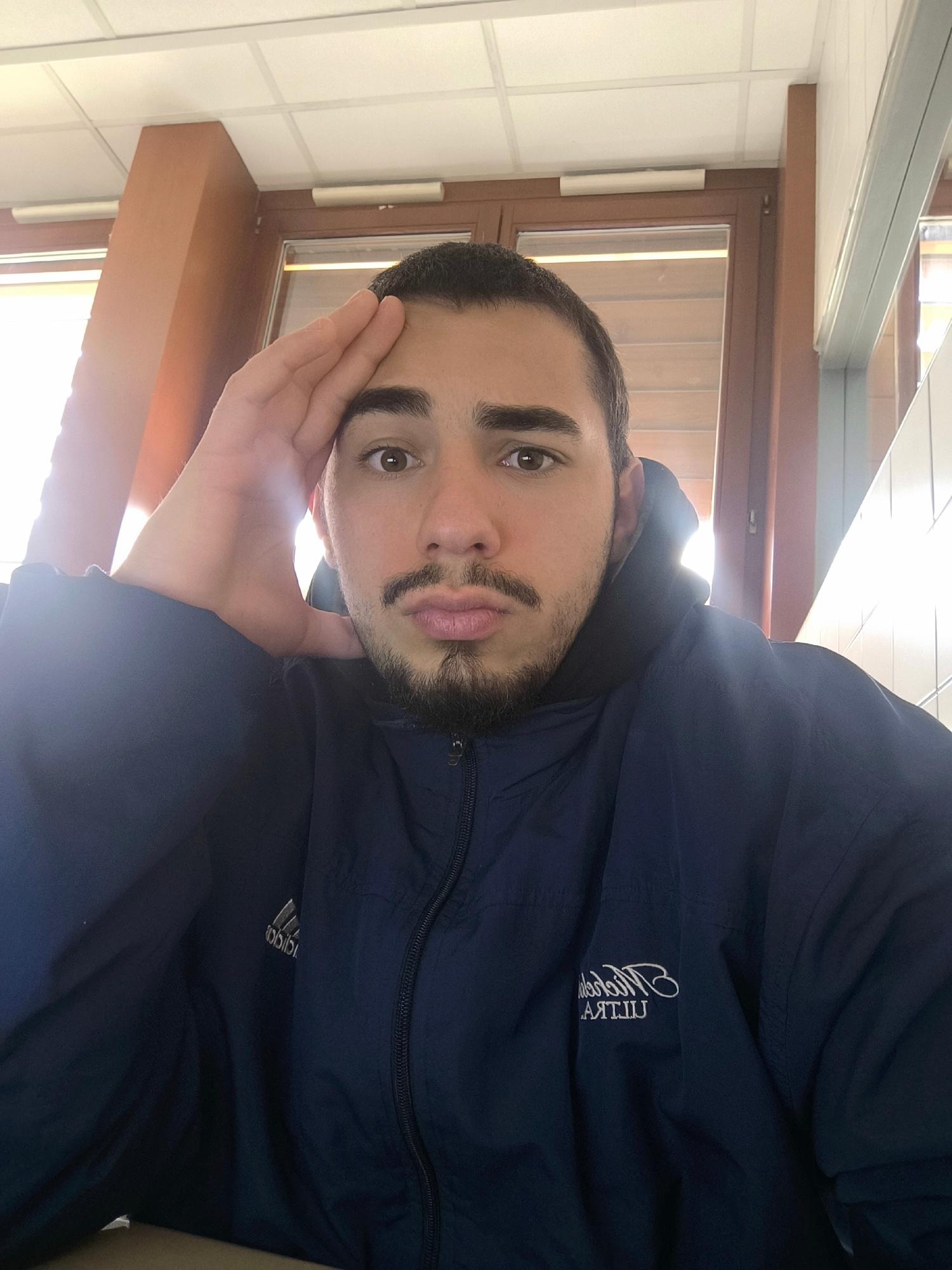 A young man with dark hair and a beard is posing for a selfie. He is wearing a dark blue Adidas jacket with the logo "Michelob Ultra" in white on the right side. His right hand is raised to his forehe…read more