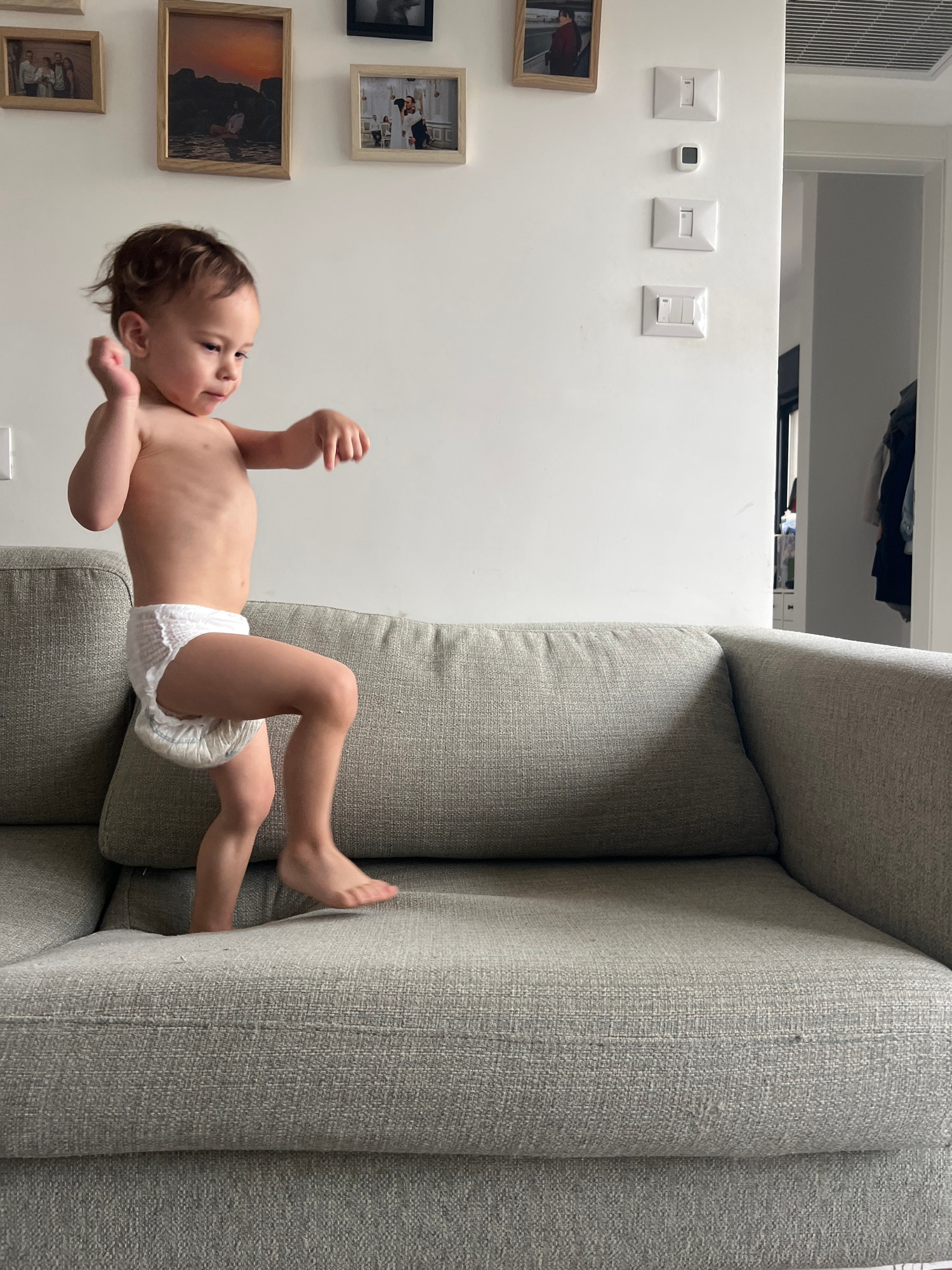 A baby wearing a diaper is on a gray sofa. The room has white walls with light switches and framed pictures. The location is Kiryat Bialik, Israel.