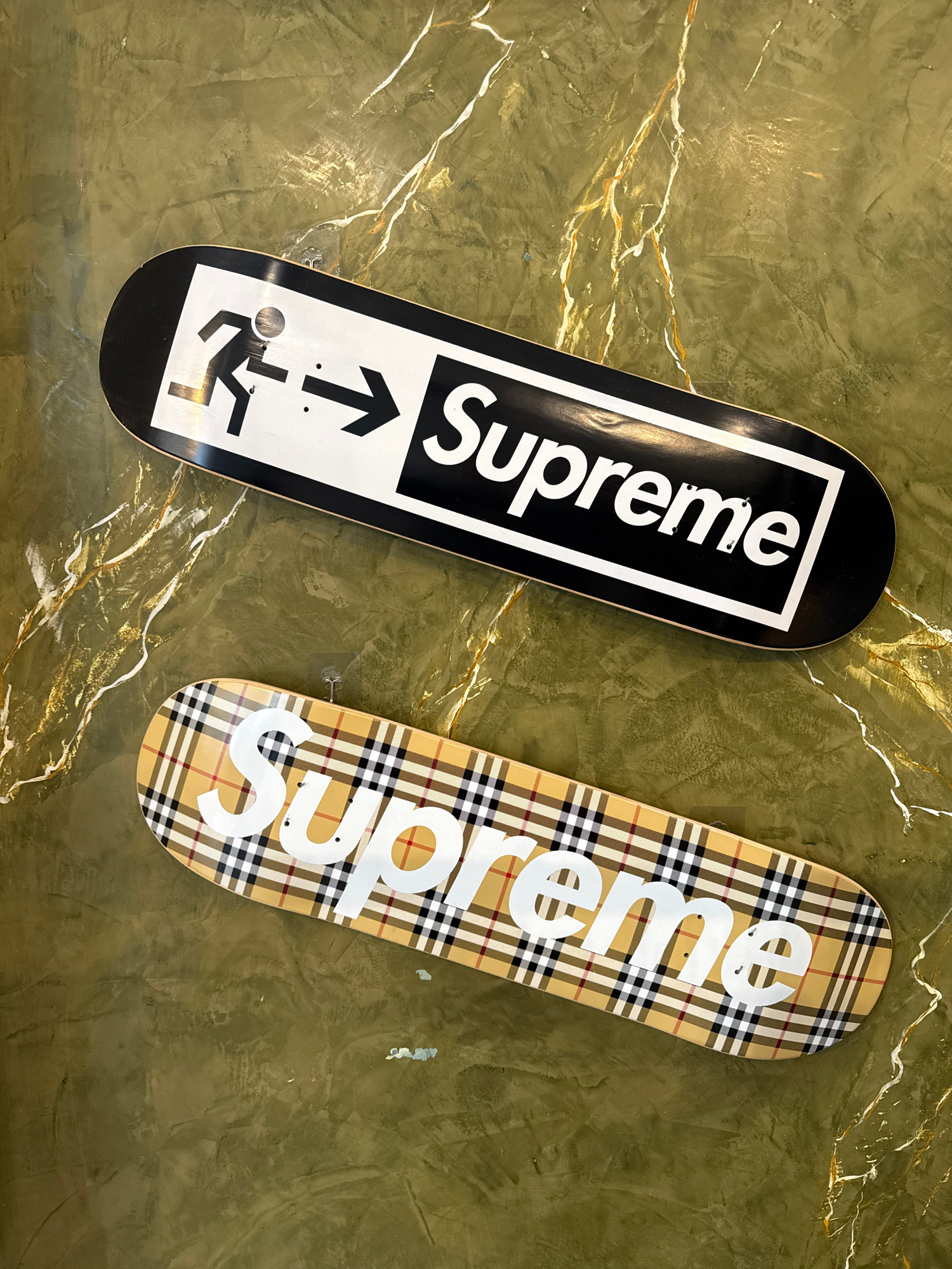 Two skateboards are prominently displayed against a textured, greenish-brown wall or floor surface that features irregular white and golden vein-like patterns, resembling marble or a decorative plaste…read more