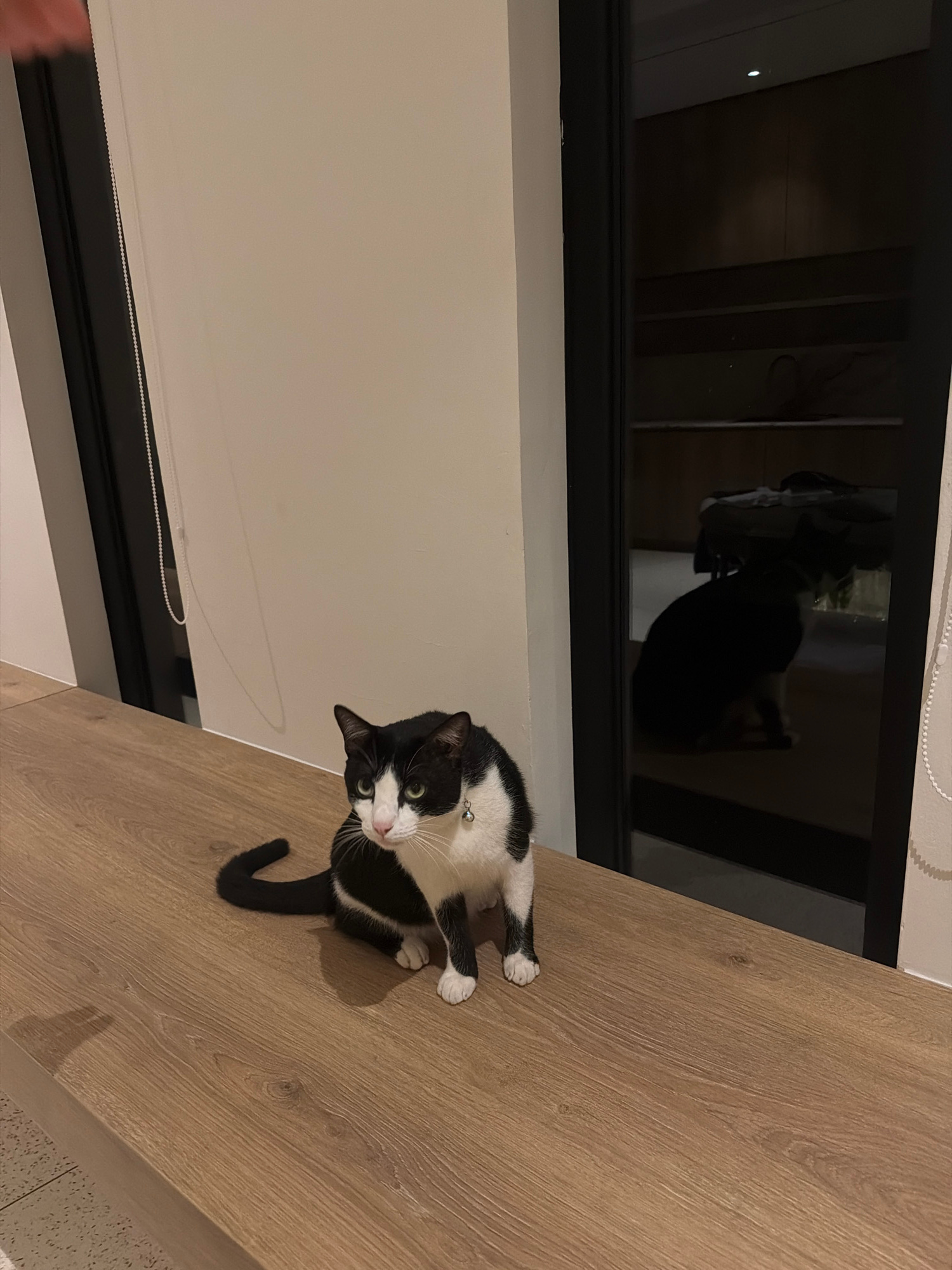 A black and white cat sits on a light brown wood surface. The surface is next to a wall and window with a reflective surface that shows a blurry reflection of a dark figure. The scene appears to be in…read more
