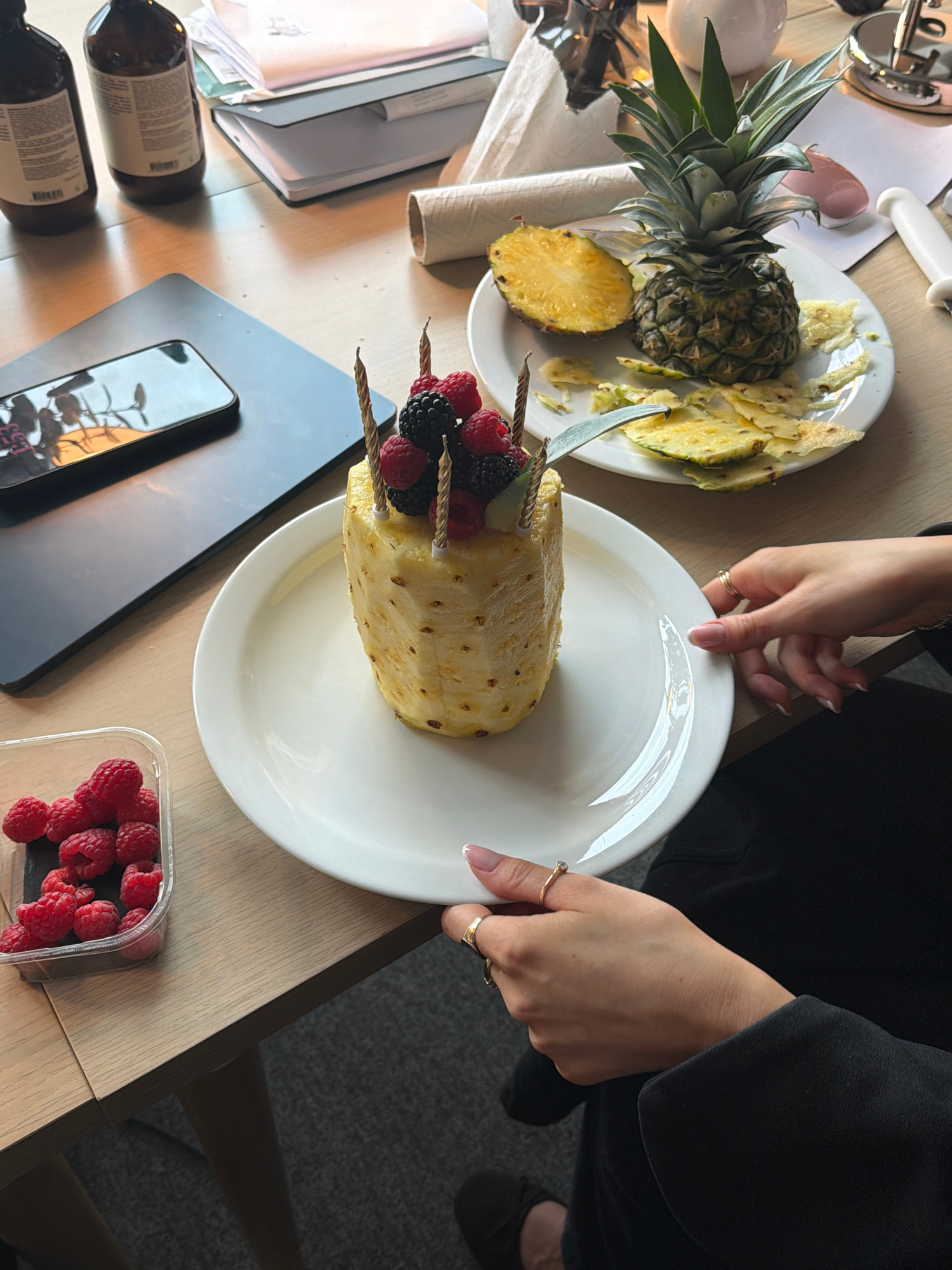 The image presents an overhead view of a light-colored wooden table in an indoor setting, consistent with a location like London, where food is being prepared or presented. The central subject is a p…read more