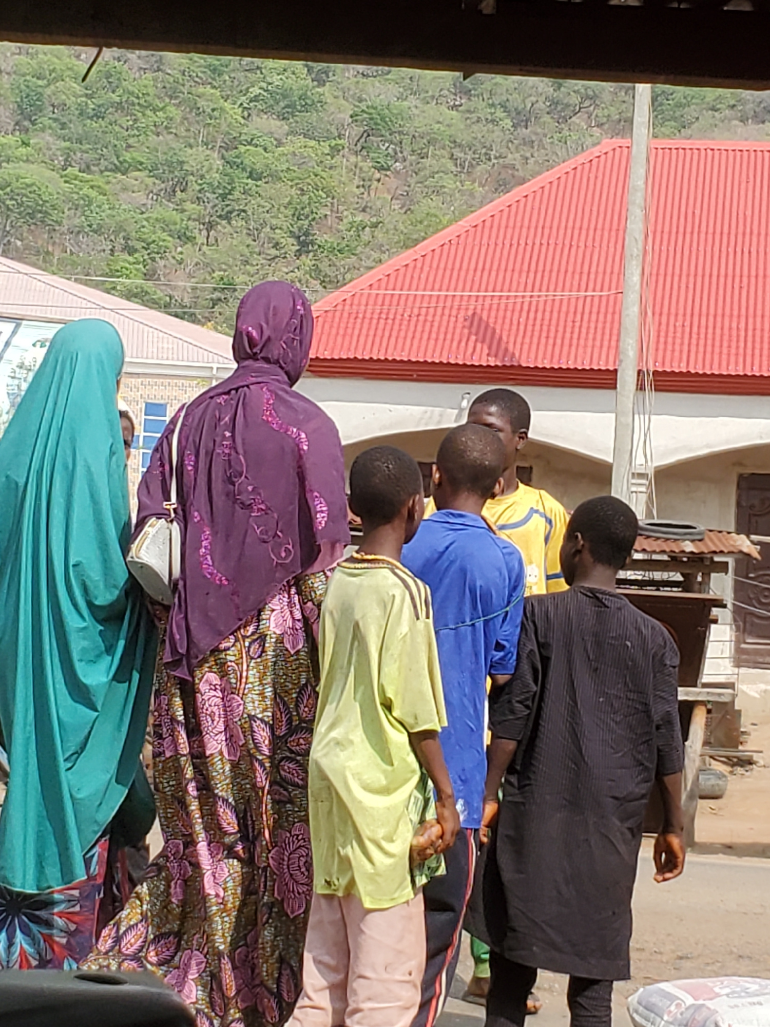 The image depicts a group of individuals standing outdoors. They appear to be of African descent. One is wearing a green headscarf and a floral print dress, and another a purple headscarf and a floral…read more