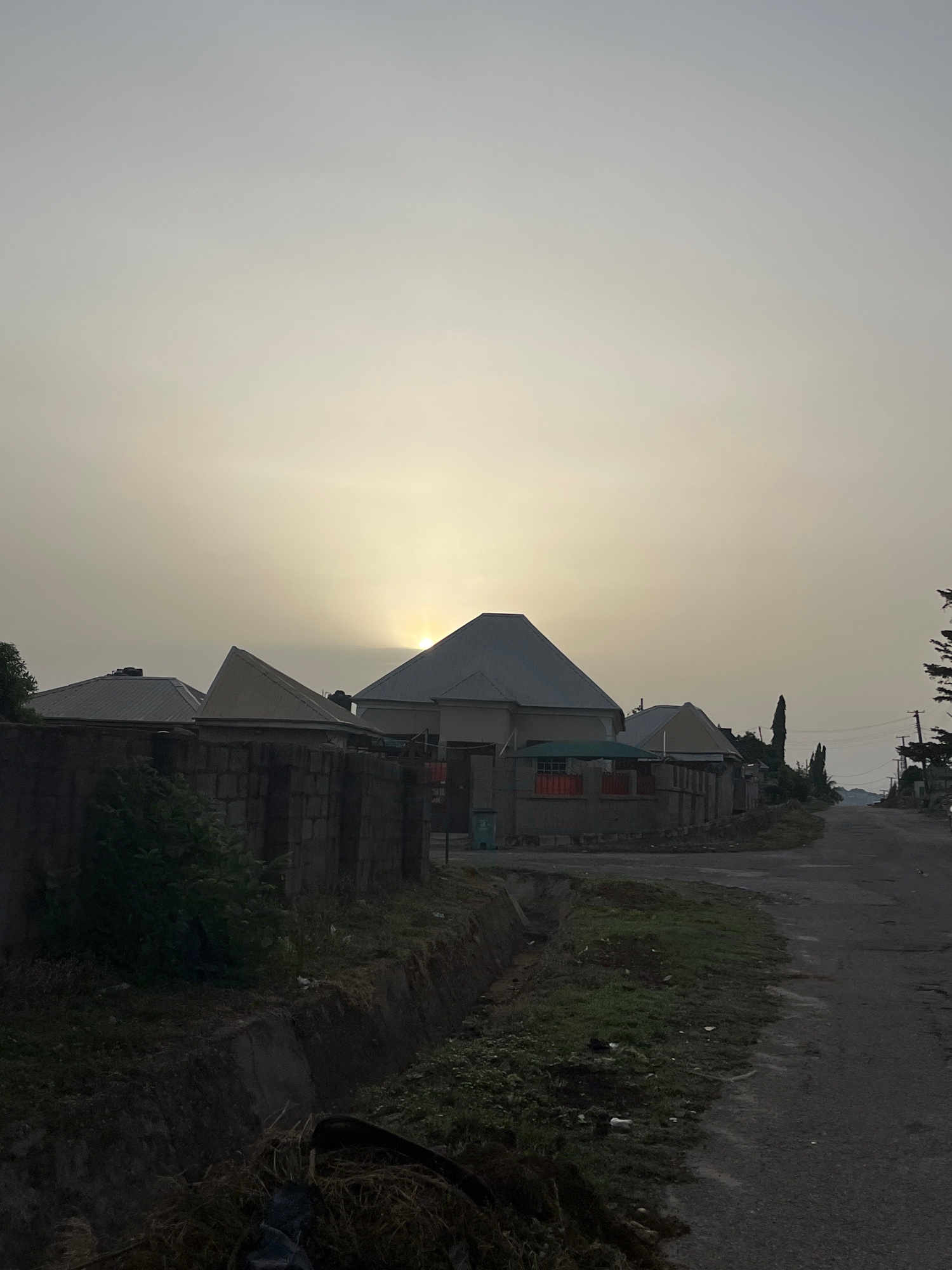 The image depicts a residential area in Abuja, Nigeria, during a time of day when the sun is low in the sky. The light is diffused, creating a hazy or smoky atmosphere. Several houses are visible alon…read more