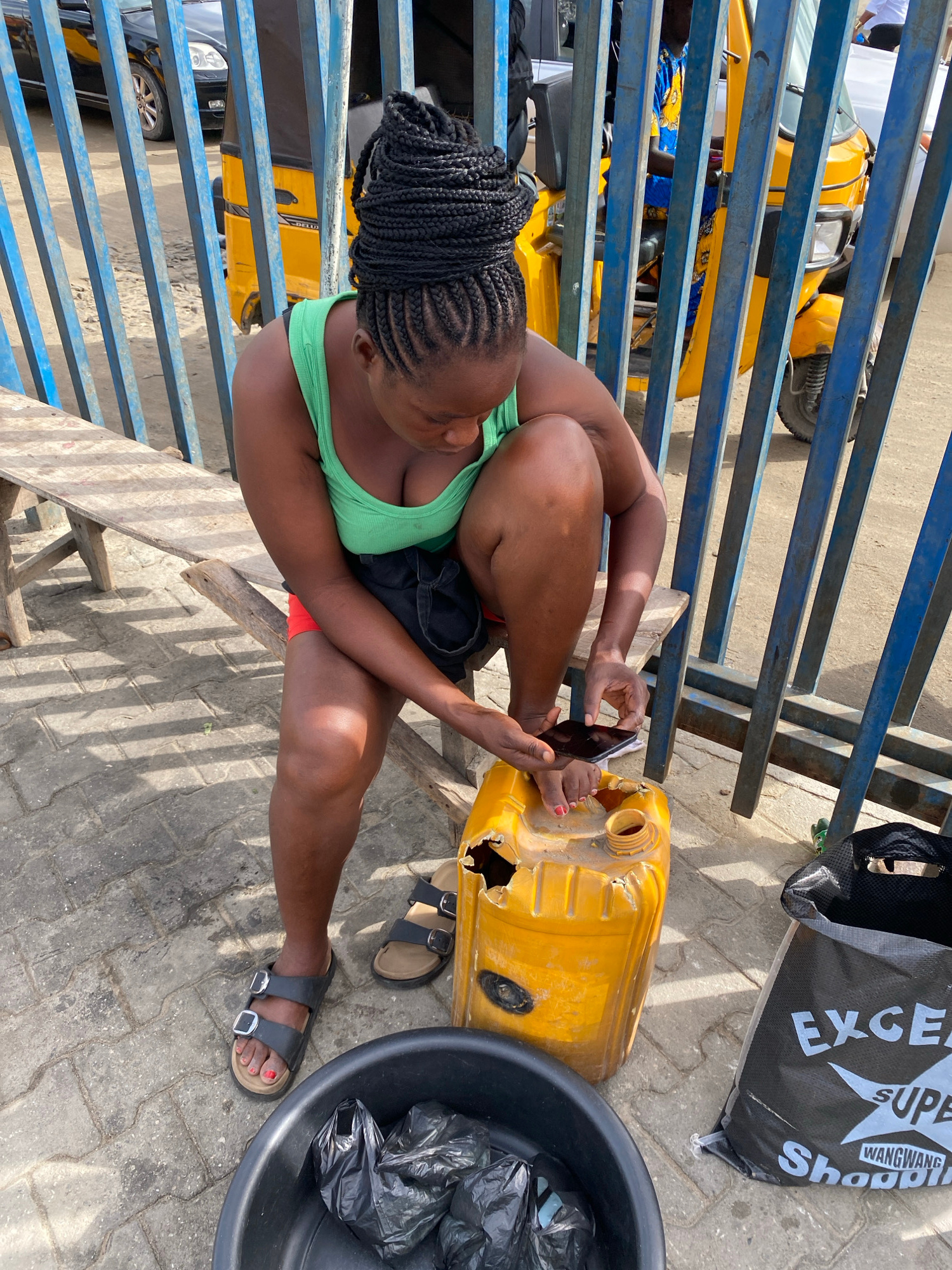 A woman with dark skin and braided hair is seated on a wooden structure next to a blue metal railing in Ado, Nigeria. She is wearing a light green tank top and shorts, and she is looking at a smartpho…read more