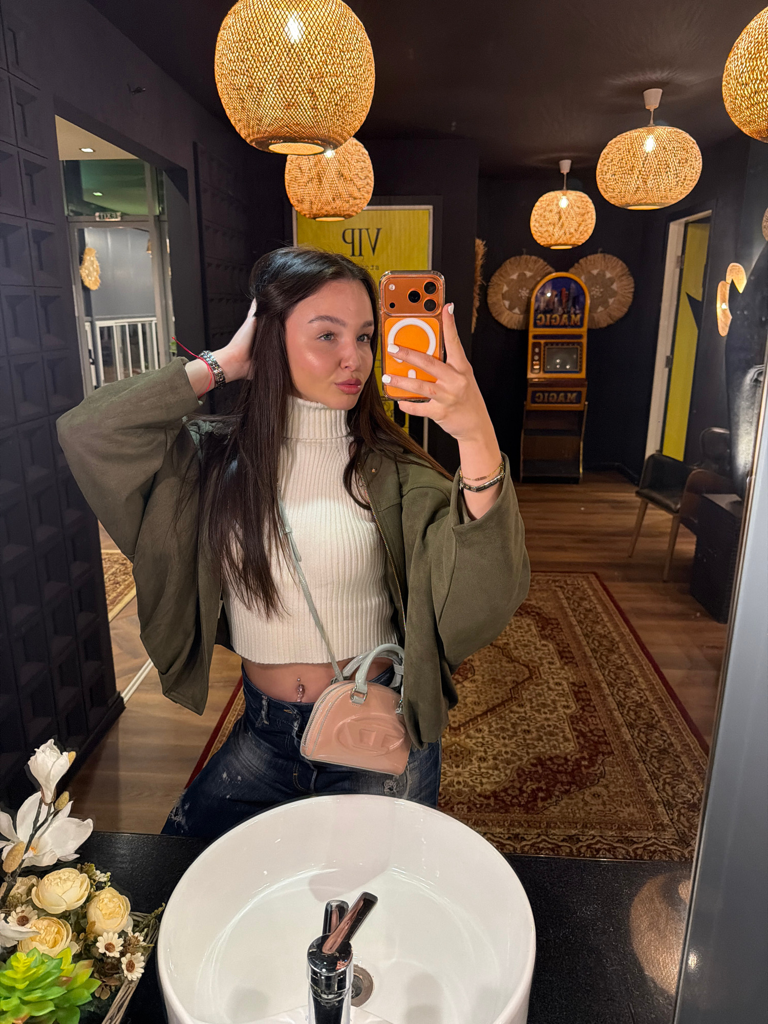 A young woman is taking a selfie in what appears to be a restroom or dressing room. She is wearing a white turtleneck crop top, dark wash jeans, and an olive green jacket. She has long dark hair and i…read more