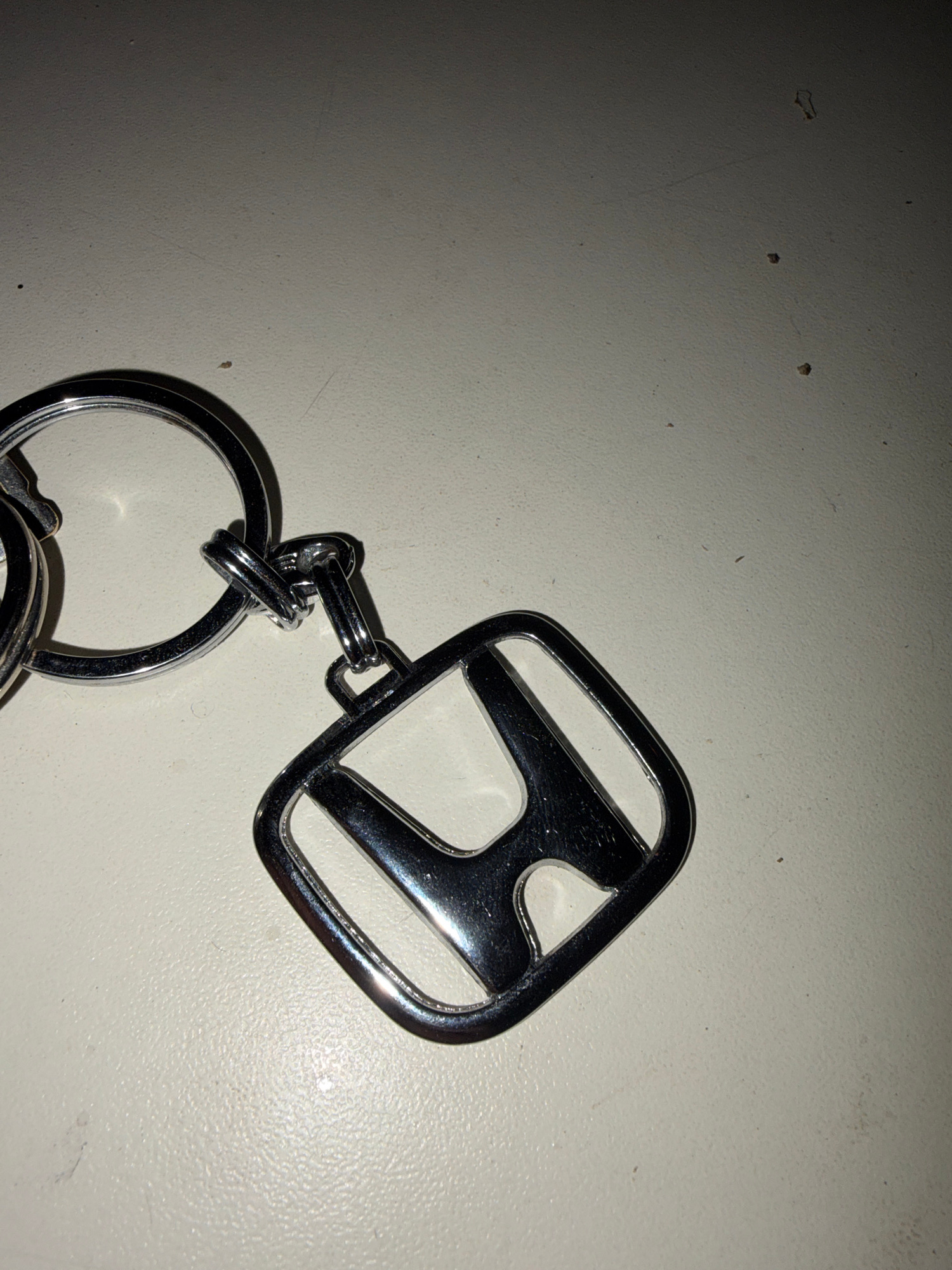 A silver Honda logo keychain is on a light-colored, slightly textured surface. The keychain has a rectangular frame with the Honda "H" logo inside. It is attached to a keyring by a short chain. No peo…read more