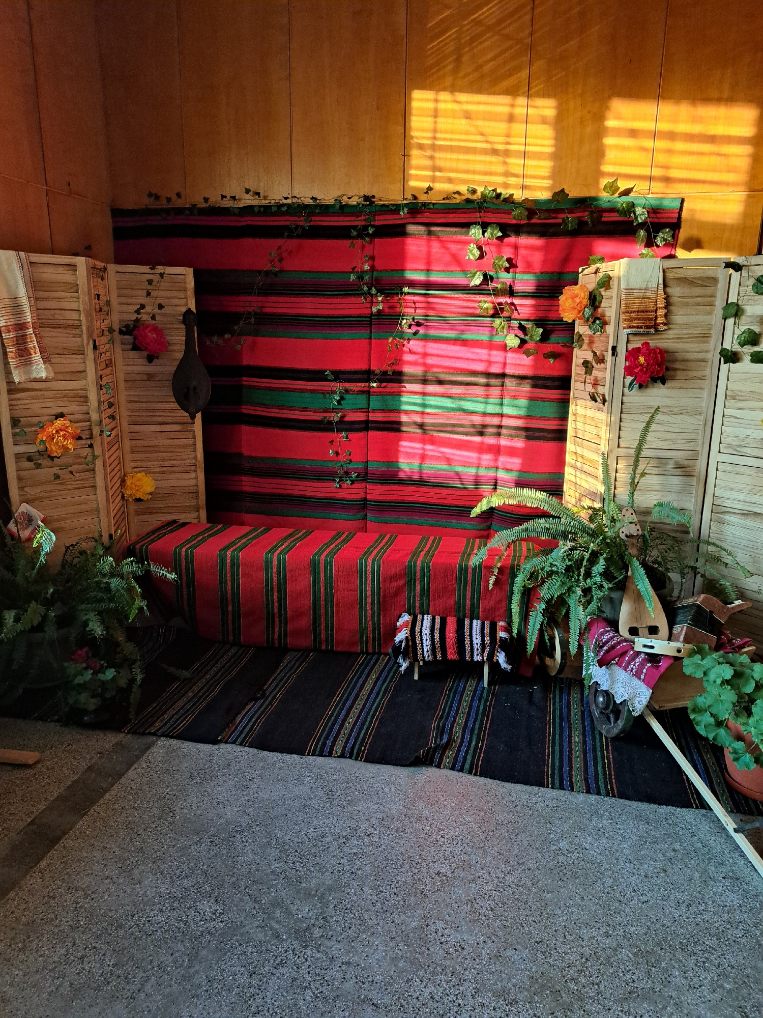The image shows an indoor scene, likely a room decorated with traditional Bulgarian textiles and objects. The walls are paneled with wood. A red and green striped rug or blanket hangs vertically along…read more