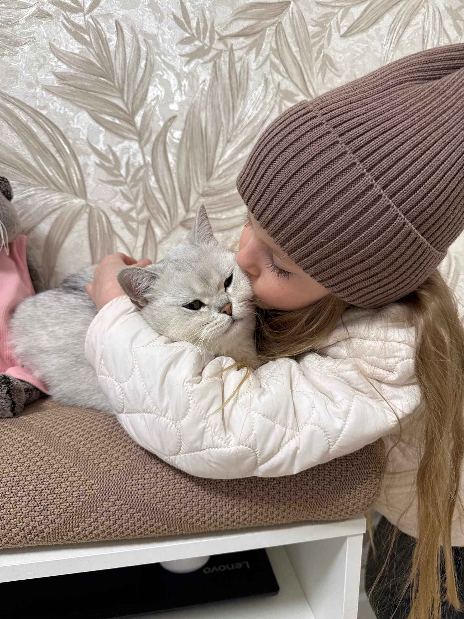 A young girl with long blonde hair wearing a brown knit hat and a white quilted jacket is cuddling a silver tabby cat with green eyes. The girl is lying on a bed with a leafy patterned bedspread. She…read more