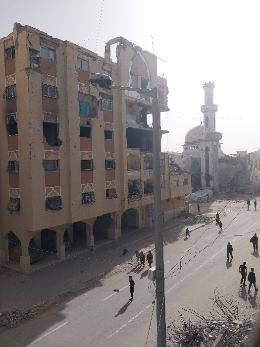 A severely damaged building stands tall, bearing multiple holes and structural damage. A mosque with a prominent dome and minaret is visible in the background, also appearing damaged. A wide road runs…read more