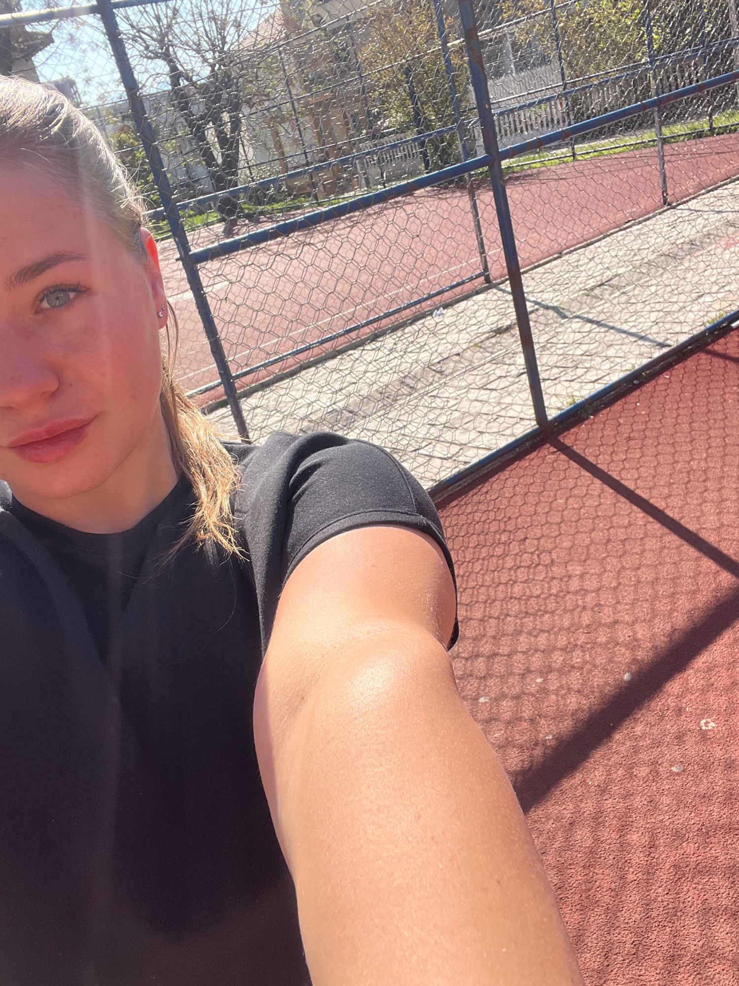 A selfie-style photograph shows a light-skinned person with blonde hair partially visible near their ear, and wearing a black shirt. Their right arm is extended towards the camera. The background cons…read more