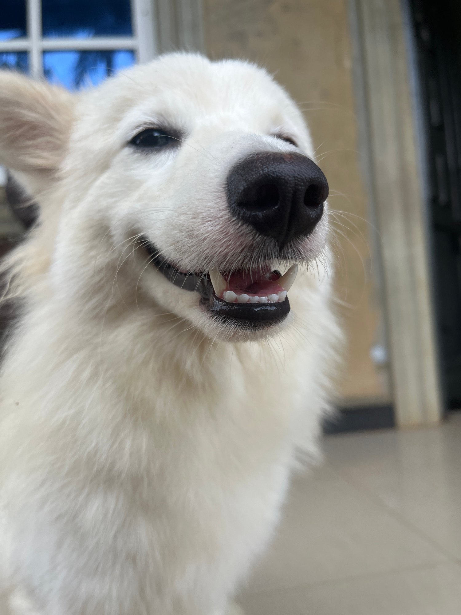 A close-up, high-angle photograph captures the head of a white dog, likely a Golden Retriever or a similar breed, looking upwards with a friendly and playful expression. The dog's black, wet nose is p…read more