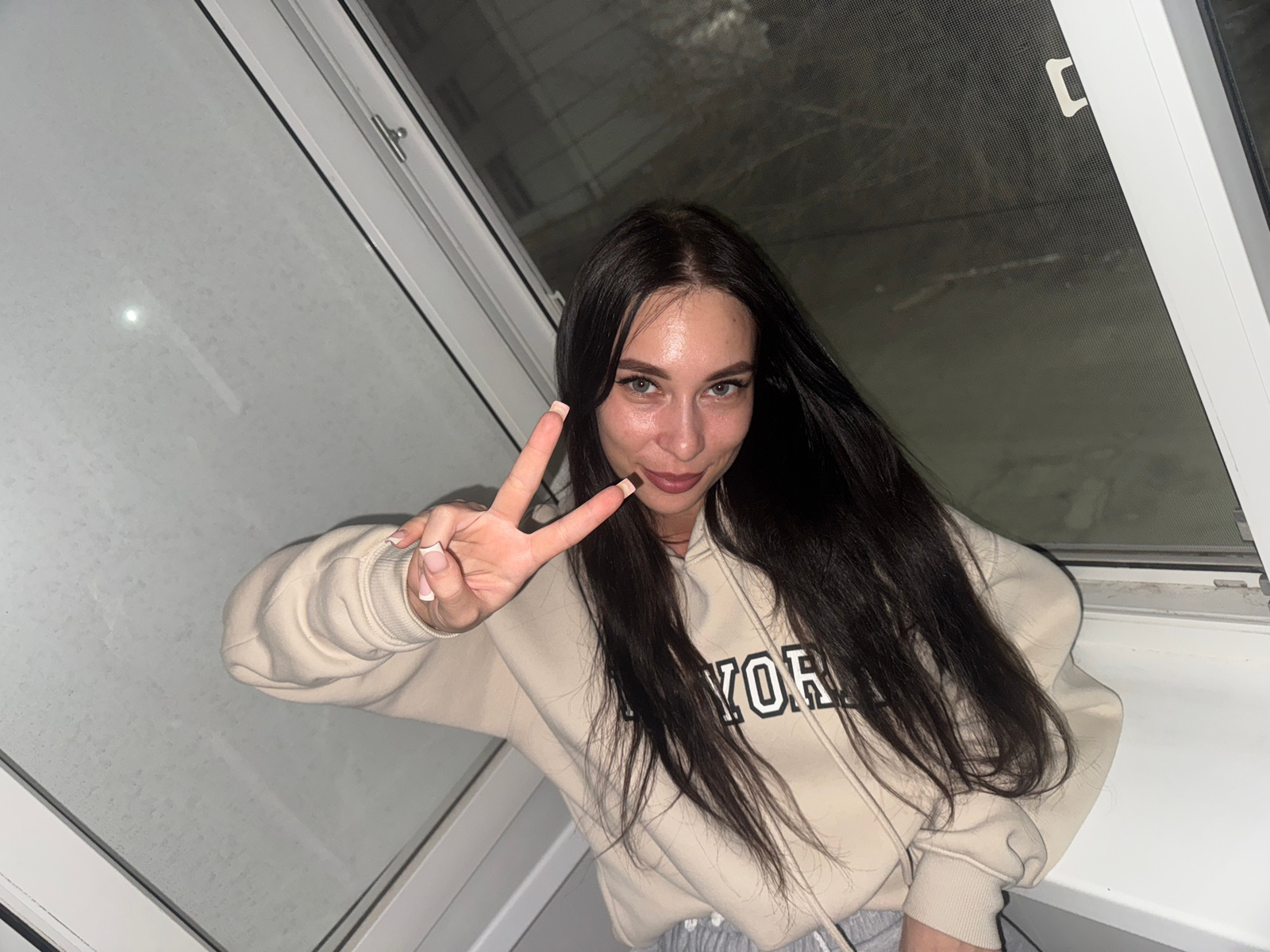 A young woman is posing indoors. She has long, dark hair and is wearing a light-colored hoodie with the word "YORK" printed on it. She is making a peace sign with her right hand. The background appear…read more