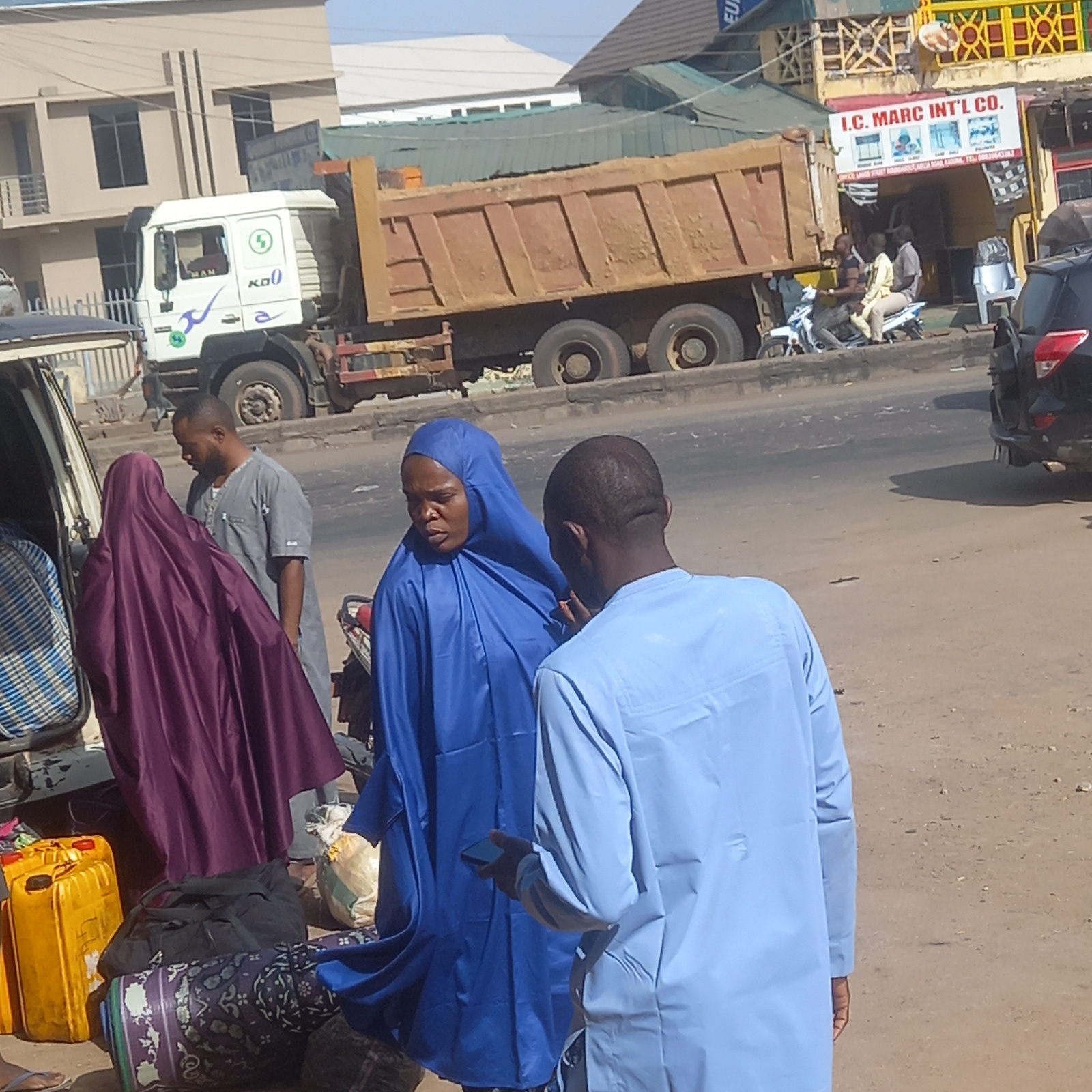 The image depicts a vibrant street scene in what appears to be an urban or commercial area, consistent with Sardauna, Nigeria, captured during a bright, dry day. The image shows a moment of everyday a…read more