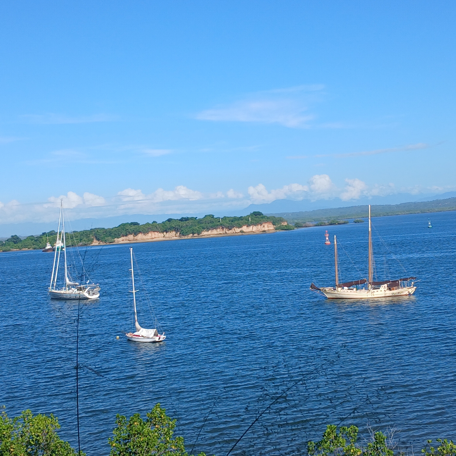 The image depicts a panoramic view of a coastal bay within the city of Tanga, Tanzania, under a clear blue sky with minimal scattered white clouds. The foreground shows the tops of green foliage from…read more