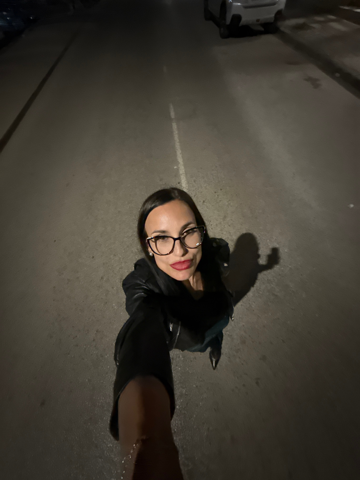 A woman is taking a selfie outdoors at night, standing on a gray asphalt surface with a white line marking on the left side. A blurred car is parked on the left, and the woman's shadow is visible behi…read more