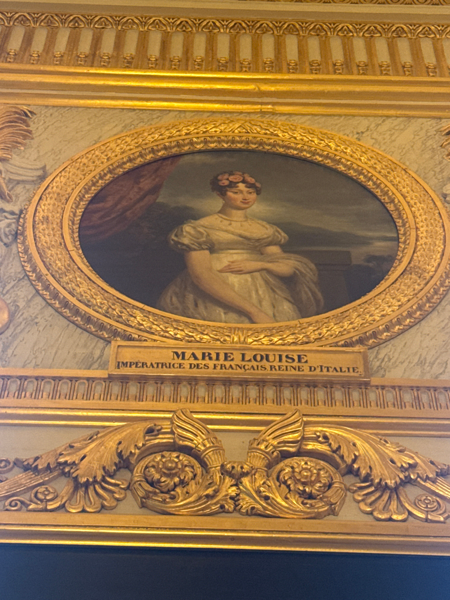 A portrait of Marie Louise, Empress of the French and Queen of Italy, is displayed in an oval frame. The frame is gold and ornate, with elaborate carvings and detailing. The portrait is set against a…read more