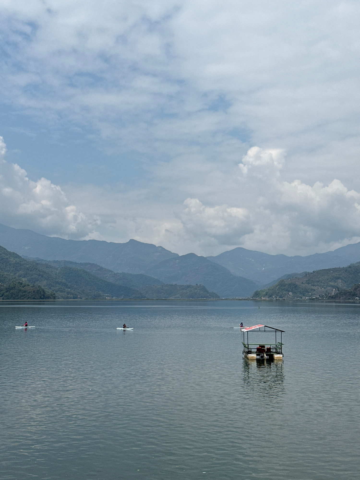 This image depicts Phewa Lake in Pokhara, Nepal. The foreground presents calm lake water. Three individuals are visible on white watercraft; two are positioned in the midground (left-center and right-…read more