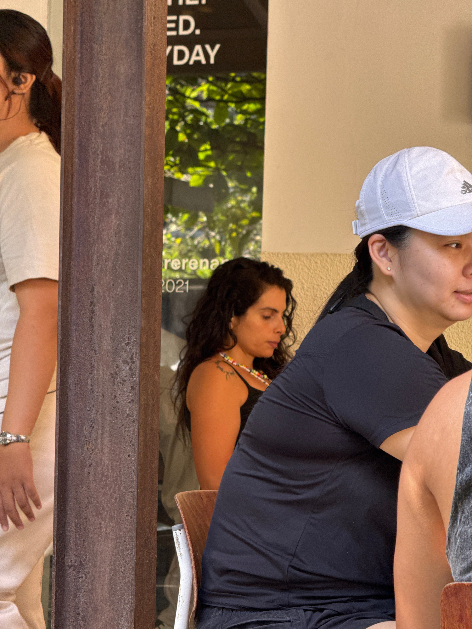 The image shows two women seated at a table in an outdoor setting. The woman in the foreground is wearing a white Adidas baseball cap and a black athletic shirt. The other woman has curly dark hair an…read more