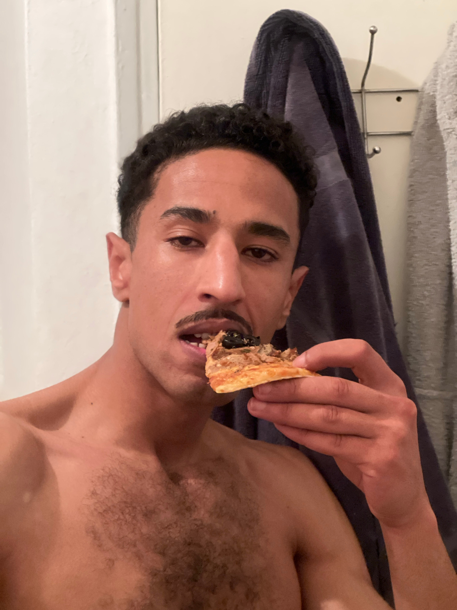 A man is eating pizza in a bathroom. He has dark curly hair, a mustache, and bare chest. He is holding a slice of pizza in his right hand and taking a bite. A gray towel hangs behind him on a hook. Th…read more