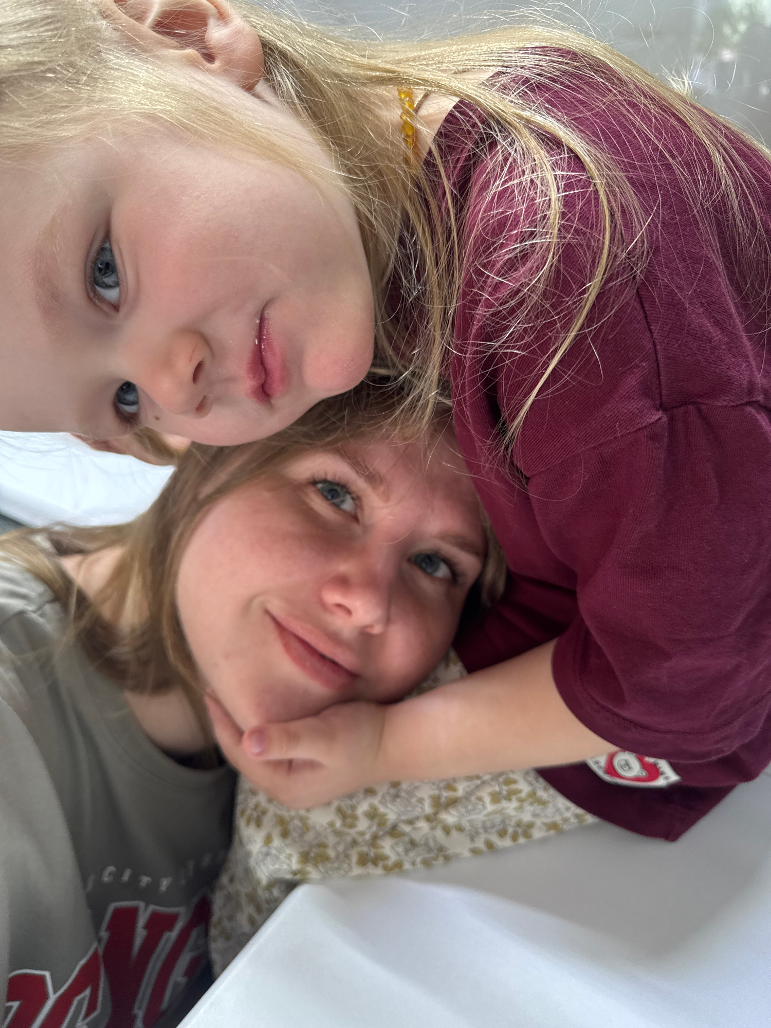 The image depicts a selfie of a woman and two children. The child on the left has blonde hair and blue eyes. The woman has blonde hair and blue eyes and is looking directly at the camera. The other ch…read more