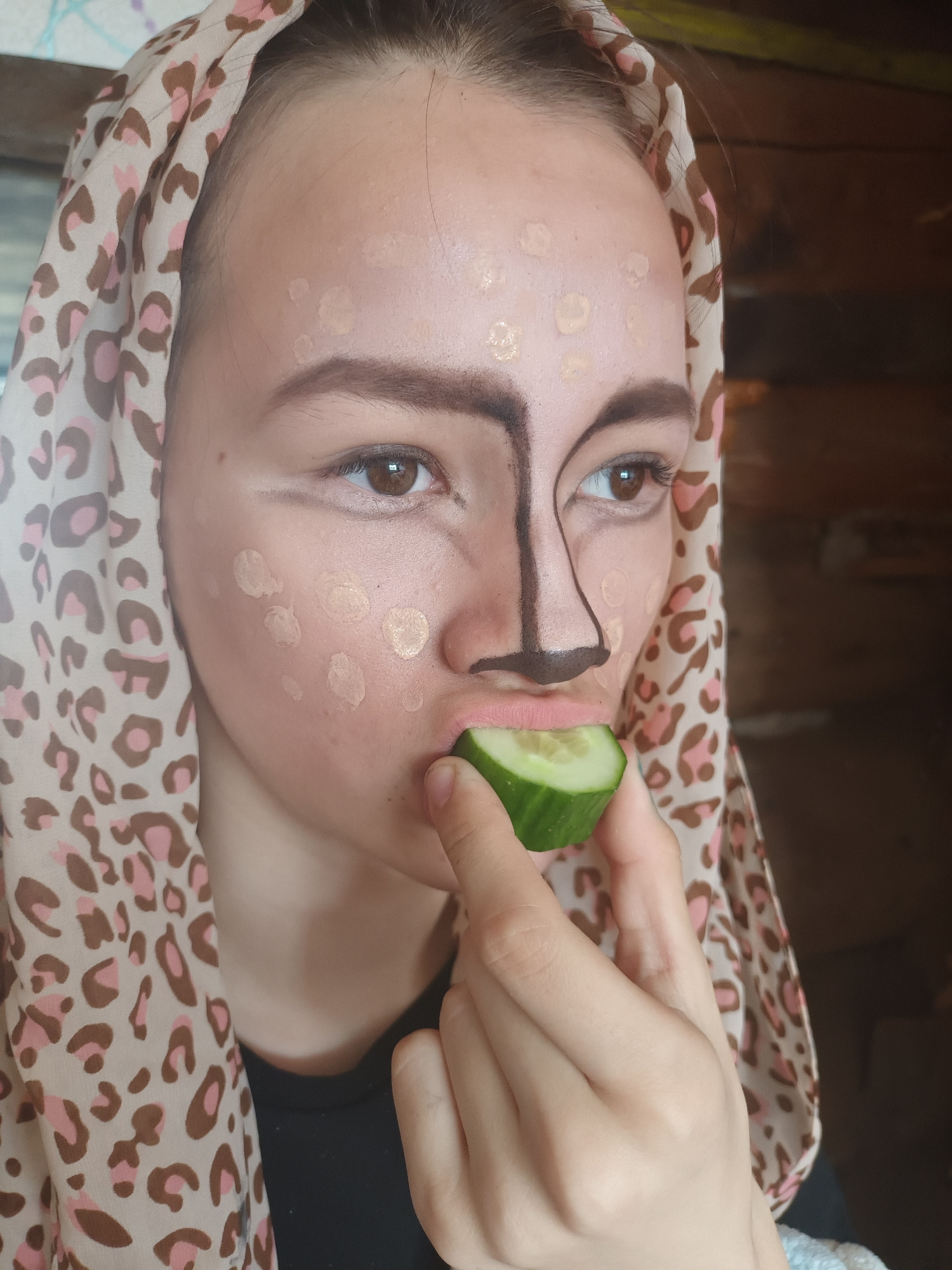 A close-up, high-angle portrait captures a young person, likely in Ольховка, Russia, engaged in applying theatrical or costume makeup. The subject is positioned horizontally, with their head resting o…read more