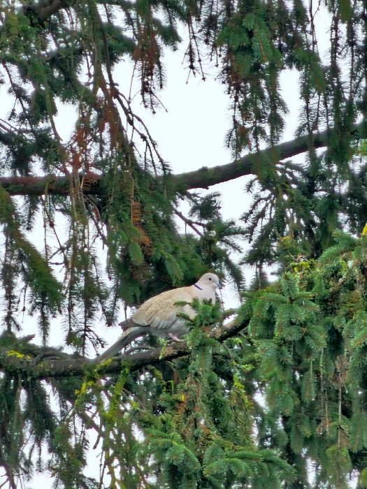 A Eurasian Collared-Dove is perched on a moss-covered branch of a densely needled conifer tree, likely a spruce or fir, under an overcast sky. The bird, positioned slightly right of the frame's center…read more