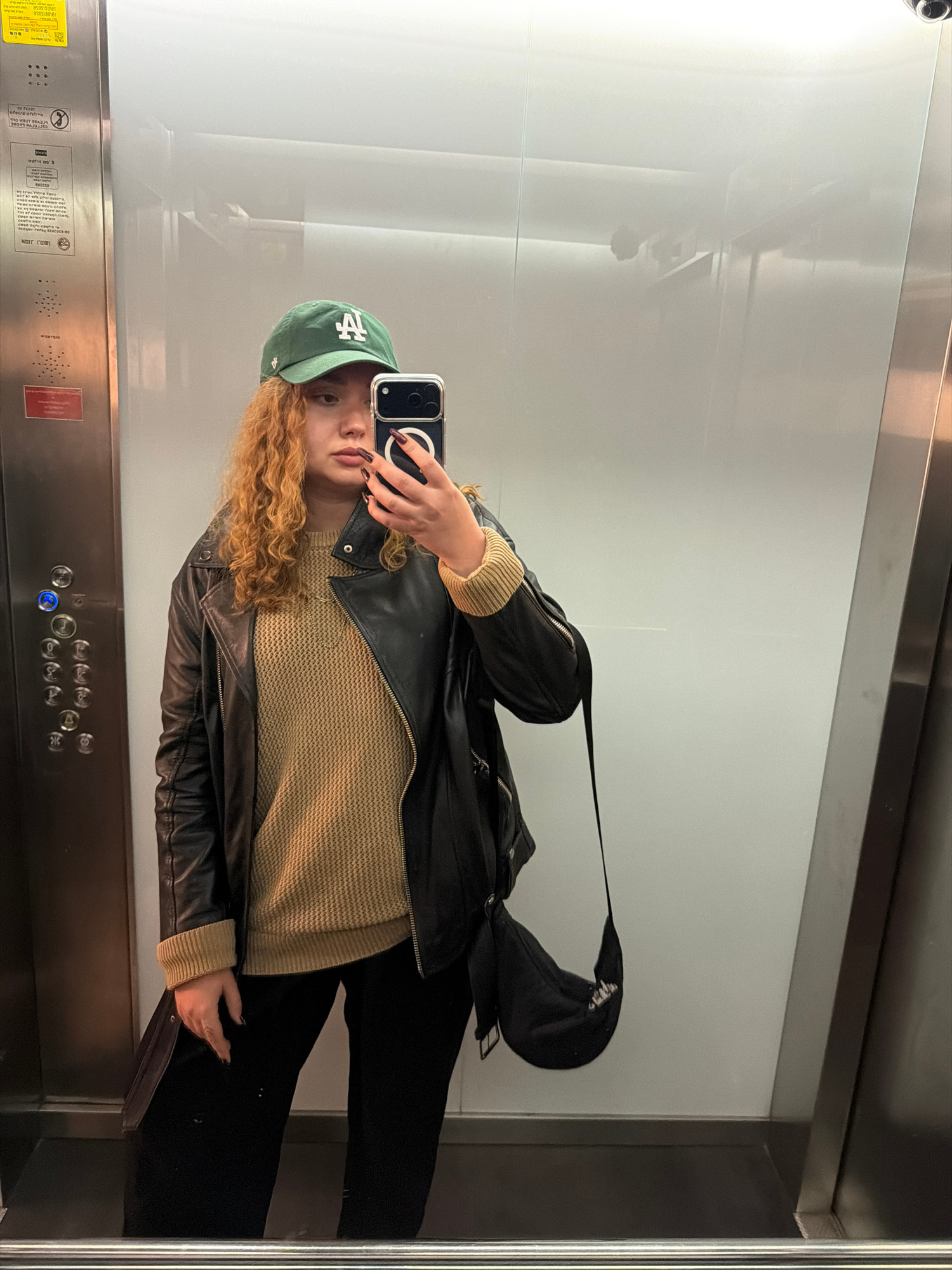 The image shows a person taking a selfie in what appears to be an elevator. The person is wearing a green baseball cap with a "LA" logo, a tan sweater, and a black leather jacket. They are holding a s…read more