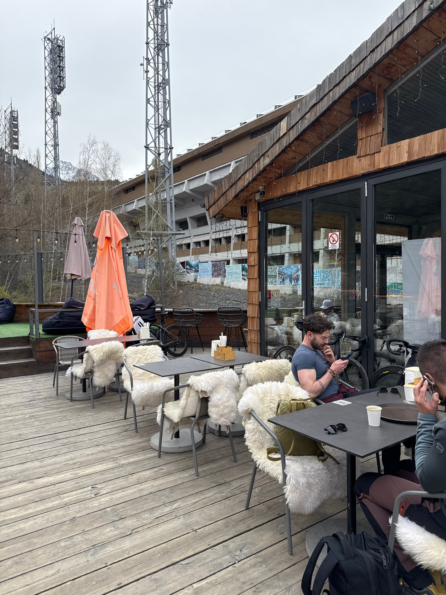This media file captures an outdoor patio scene at what appears to be a mountain resort or cafe in Almaty, Kazakhstan, under an overcast sky. The patio features a wooden deck and several black tables…read more