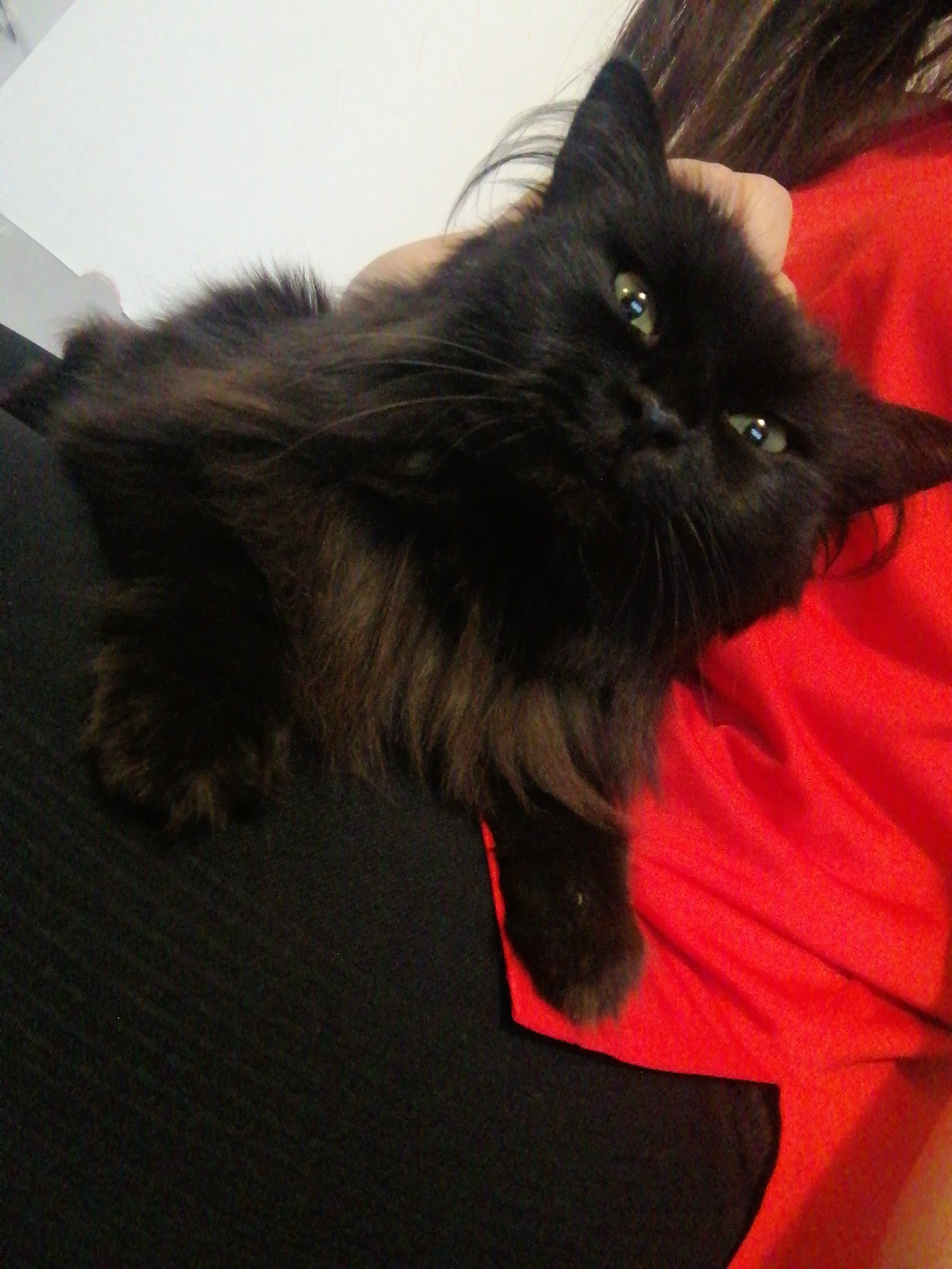In Markovskii, Russia, a black, long-haired domestic cat with green eyes is depicted. The feline is positioned facing the viewer, with its head slightly tilted. A human hand, with a light skin tone, i…read more