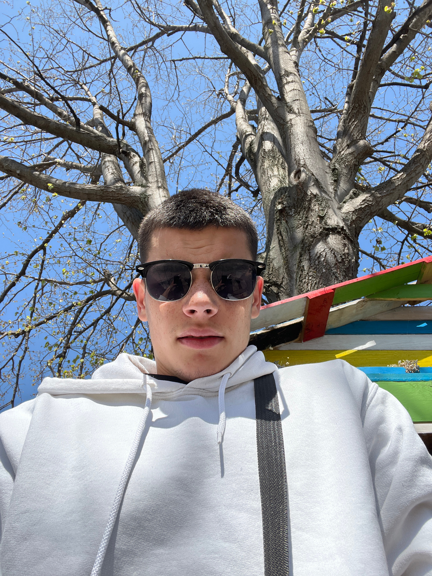A young man is featured in a close-up, upward-angled shot outdoors, likely a selfie. He has short, dark hair and is wearing black sunglasses with gold-colored accents on the temples. His expression is…read more
