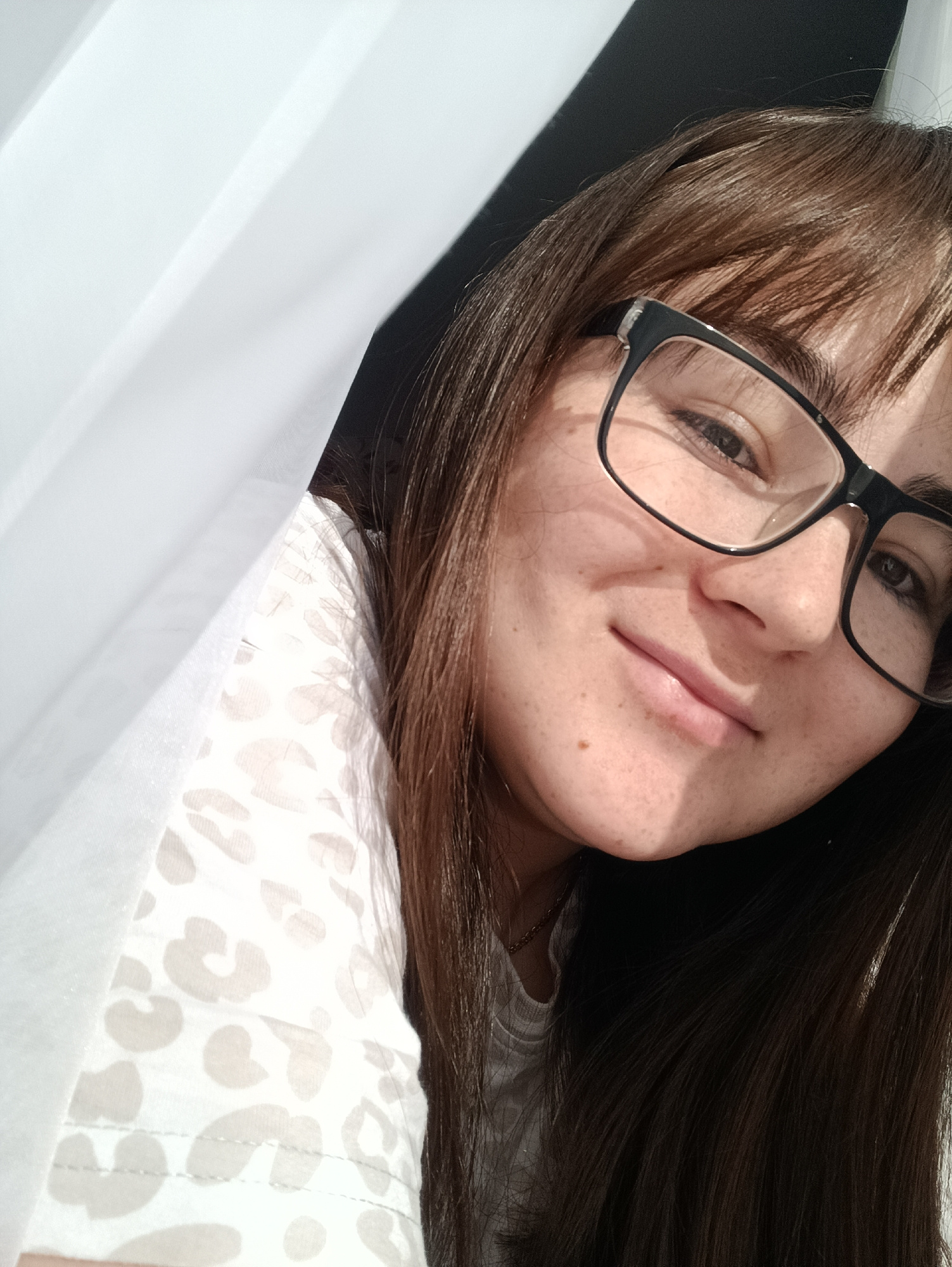 A close-up indoor shot shows a woman with brown hair and bangs, wearing black-framed glasses, and a light-colored shirt with a beige pattern. She is partially obscured by a white curtain on the left sβ¦read more