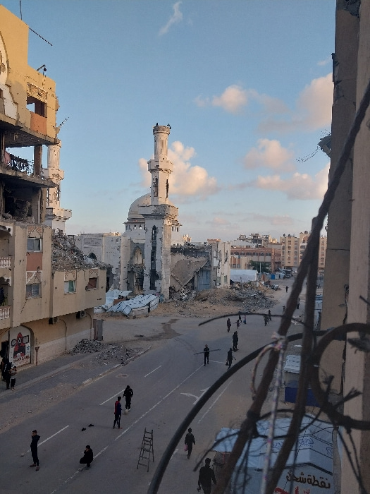 This detailed image depicts a severely damaged urban landscape in Khan Yunis, Palestinian Territory, under a partly cloudy, light blue sky. The central focal point is a significantly damaged mosque wi…read more