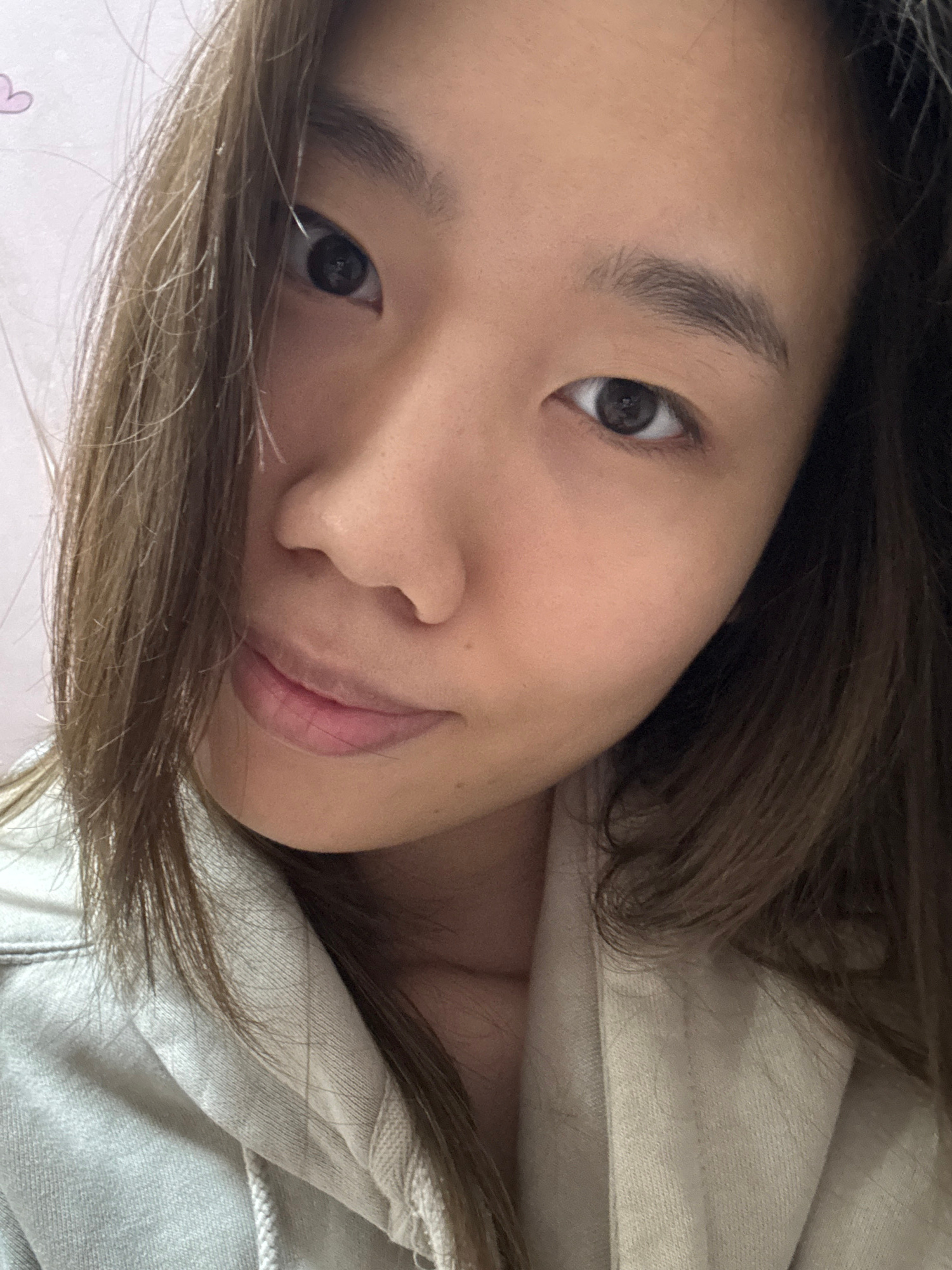 A close-up, angled shot shows a woman's face. She has light brown hair, brown eyes, and fair skin. Part of her hair is in the foreground, covering a portion of the lower left. She is wearing a light-c…read more