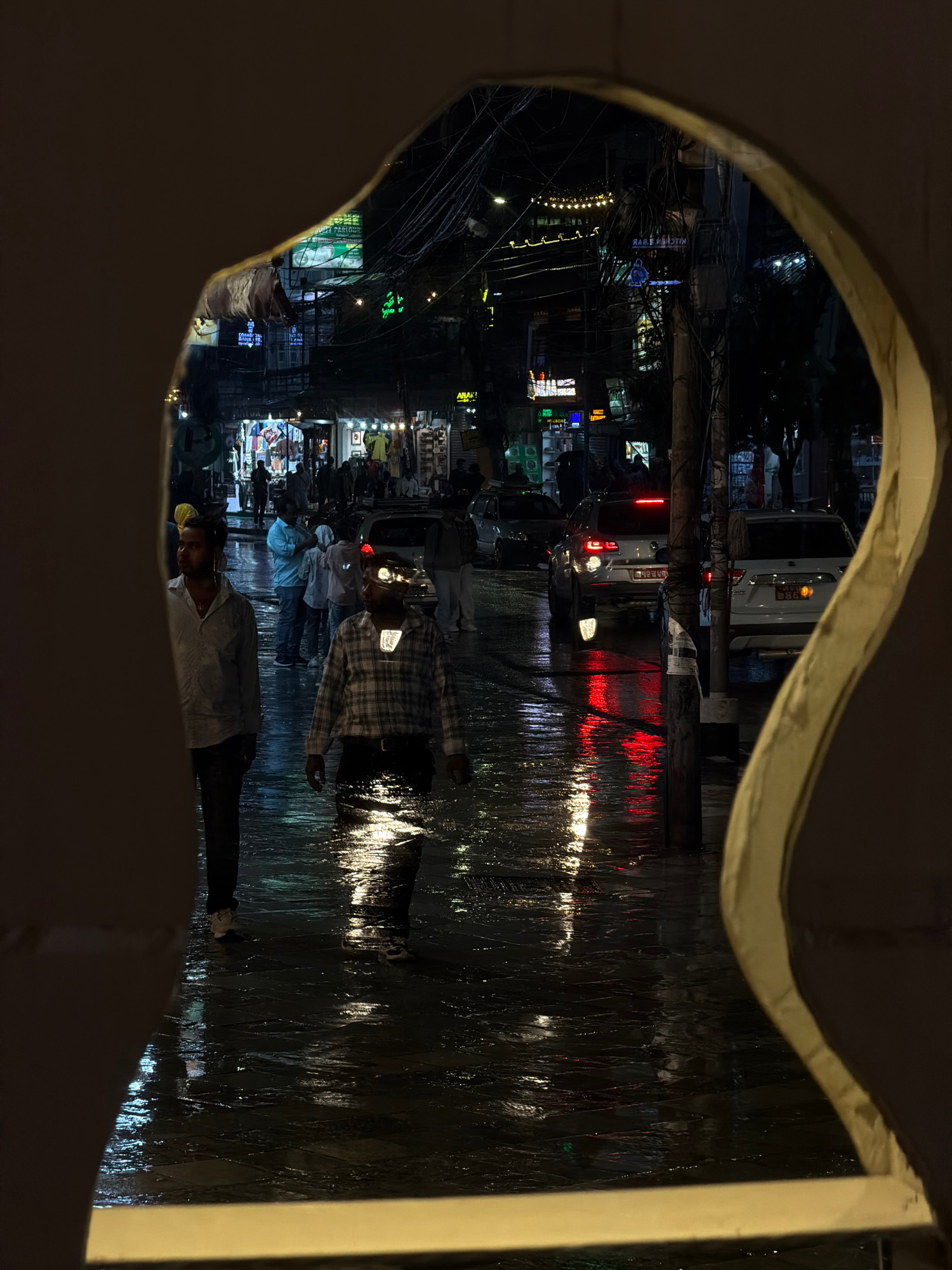 Captured through a guitar-shaped window or opening, the image portrays a street scene in what is identified as Pokhara, Nepal, on what appears to be a rainy night. The street is glistening, reflecting…read more