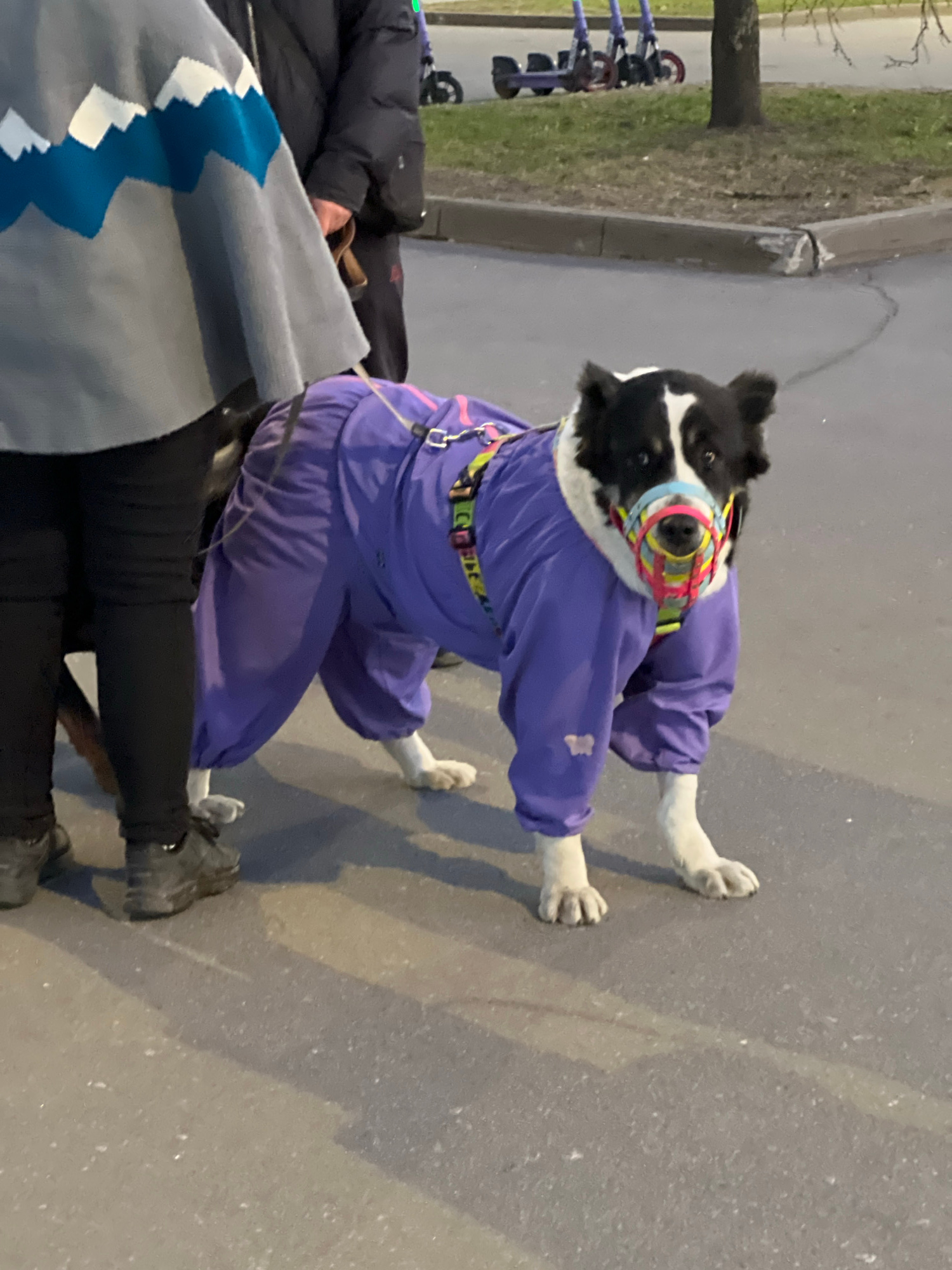The image shows a dog wearing a purple suit and a multi-colored muzzle. The dog is on a leash held by a person who is wearing a gray sweater with a blue and white zig-zag pattern, black pants, and gra…read more