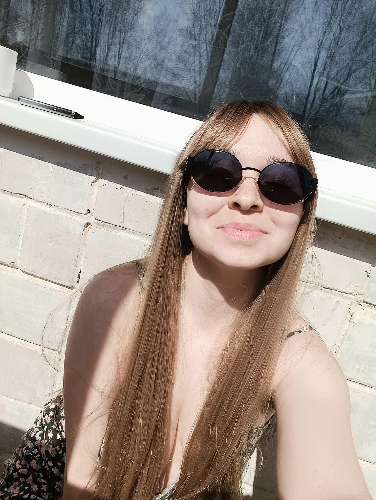 A young woman with long, straight, light brown hair is depicted in a bright, sunlit portrait. She wears dark, round sunglasses and a dark top with a white and pink floral pattern. Her lips are slightl…read more