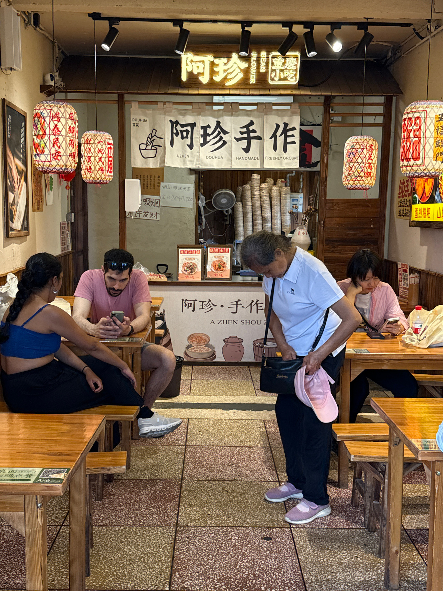 Here is a detailed description of the image: **General Overview:** The image shows the interior of a restaurant or cafe, with several people seated at wooden tables and chairs. The overall atmosphere…read more