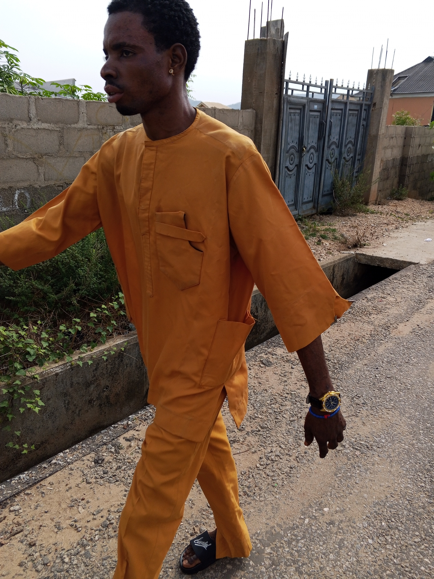 An outdoor, eye-level shot features a dark-skinned individual walking on a partially unpaved, gravelly road in Zango-Ndaji, Nigeria. The person is seen from the waist up, in a side profile, looking to…read more