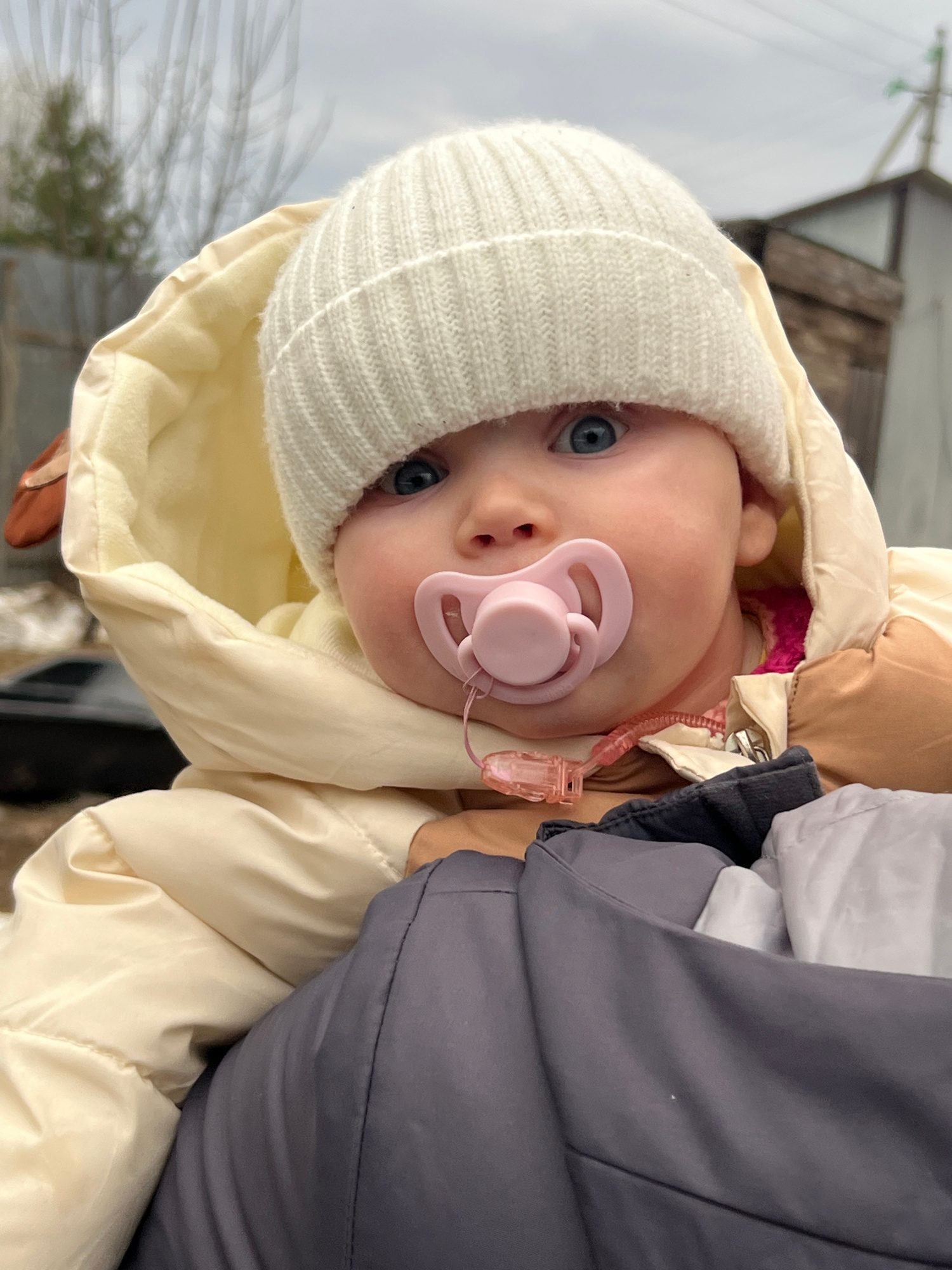A baby with blue eyes and a pink pacifier is wearing a white knit hat and a cream-colored hooded jacket. The baby is facing the camera and is positioned against a background with a gray sky and a buil…read more